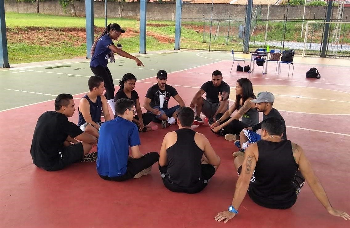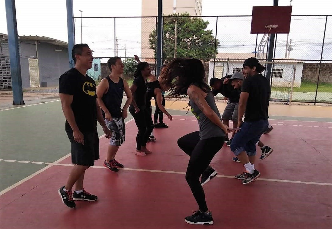 Após o encontro, e ainda antes do workshop, foi realizada uma aula de campo, buscando a preparação das coreografias e o início das apresentações. Antes disso, os alunos tiveram tempo para se aquecer e alongar: “Foi um momento promissor, os alunos puderam criar como docentes, ao mesmo tempo em que se sentiam artistas”, comenta a tutora.