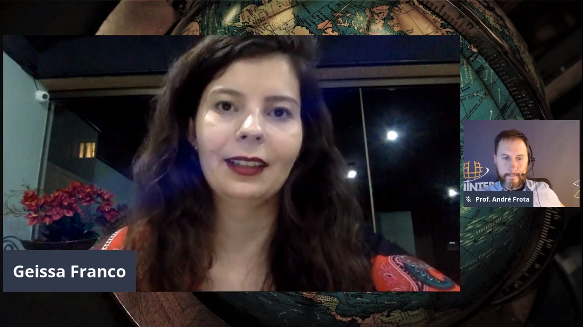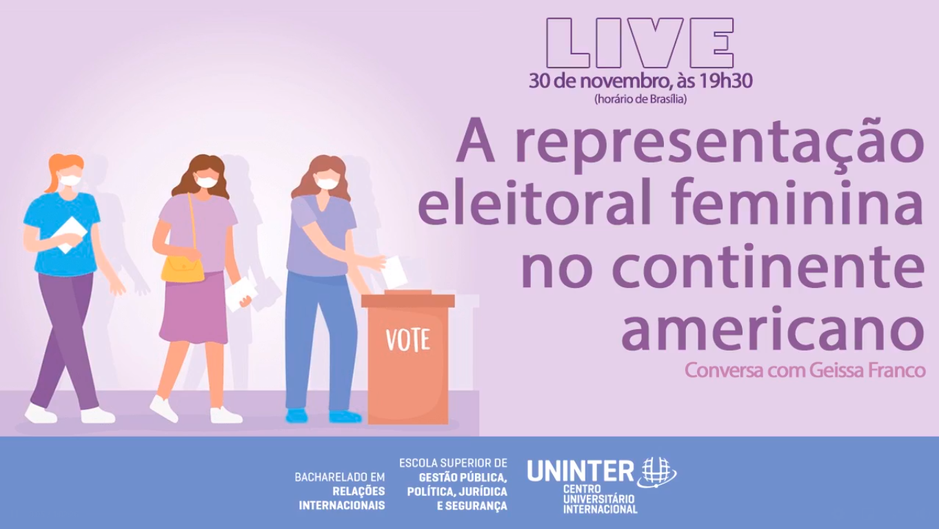 A politóloga, egressa dos cursos de Ciência Política e Secretariado Executivo da Uninter, comentou sobre o tema da representação eleitoral feminina no continente americano. A fala aconteceu em live realizada pelo curso de Relações Internacionais, com mediação do professor André Frota e transmissão pelo Facebook em 30.nov.20.