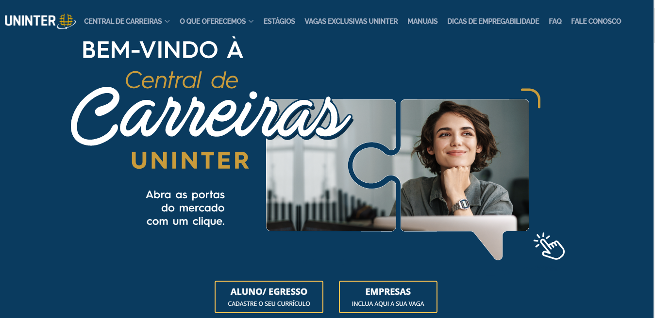 A Central de Carreiras da Uninter é um atalho por meio do qual alunos e egressos da instituição podem encurtar o caminho em busca da tão cobiçada profissão. Reestruturado recentemente, o departamento dispõe de um novo site onde são oferecidas vagas de estágio e de emprego, dicas de como se comportar em entrevistas de trabalho, orientação de carreira e para elaboração de currículo, além de capacitação profissional.