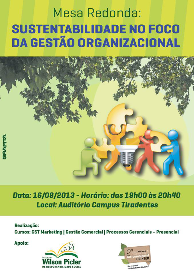 O Centro Universitário UNINTER promove no dia 16 de setembro, no auditório do Campus Tiradentes, a mesa redonda Sustentabilidade no Foco da Gestão. O evento é uma iniciativa da coordenadora do curso de Processos Gerenciais, Vanessa Estela Kotovicz Rolon, com apoio do Instituto Wilson Picler. Para o professor Elizeu Barroso Alves, a ideia é trazer essa discussão [sustentabilidade] ao mundo acadêmico, pois é onde se formam os gestores. “A sustentabilidades é um tema de preocupação global, já que nossos recursos naturais são finitos, portanto, cabe aos administradores entender e aplicar o conceito de crescer sustentavelmente”, afirma. No dia, estarão presentes os professores Felipe Luiz e Claudio Aurélio Hernandes, que após um período de palestras irão para debater com os alunos.