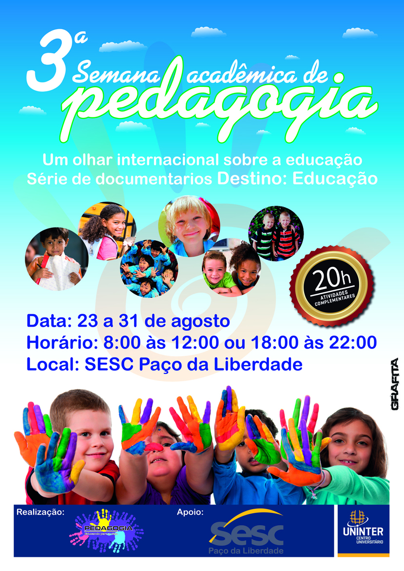 Entre os dias 23 e 31 de agosto, o Centro Universitário UNINTER, com o apoio do Sesc, promove a III Semana Acadêmica de Pedagogia. Este ano serão exibidos sete documentários sobre a educação em diversos países. As visitas ao Sesc Paço da Liberdade serão divididas em turnos. Confira o cronograma: