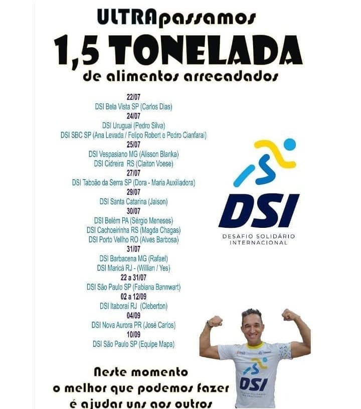 “O interessante é que aconteceram outros desafios solidários que nem eu que sou o idealizador sabia, como foi o caso do DSI Uberaba (MG) e DSI Carbonita (MG), que eu soube só depois que já tinham terminado, através de vídeos, fotos e arrecadações. O DSI era um evento privado, que virou público, ficou grande e hoje está gigante. Todos correndo por uma causa. Trocando suor por alimento. Alguns, como eu, decidiram que não correrão mais se não for para ajudar alguém”, finaliza Cleberton.