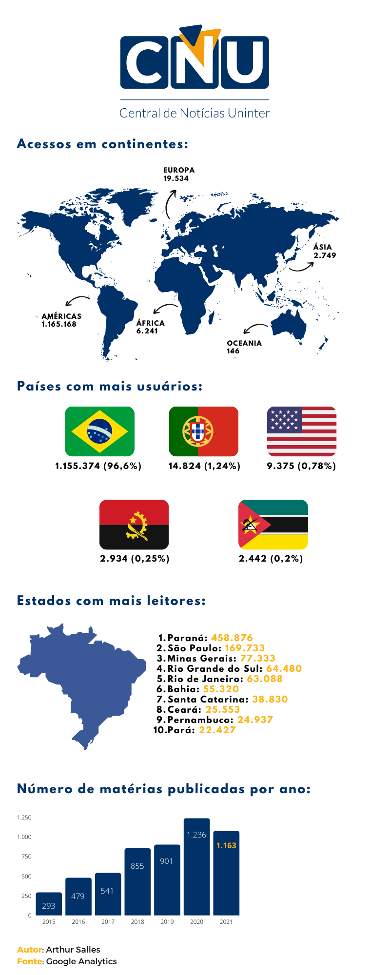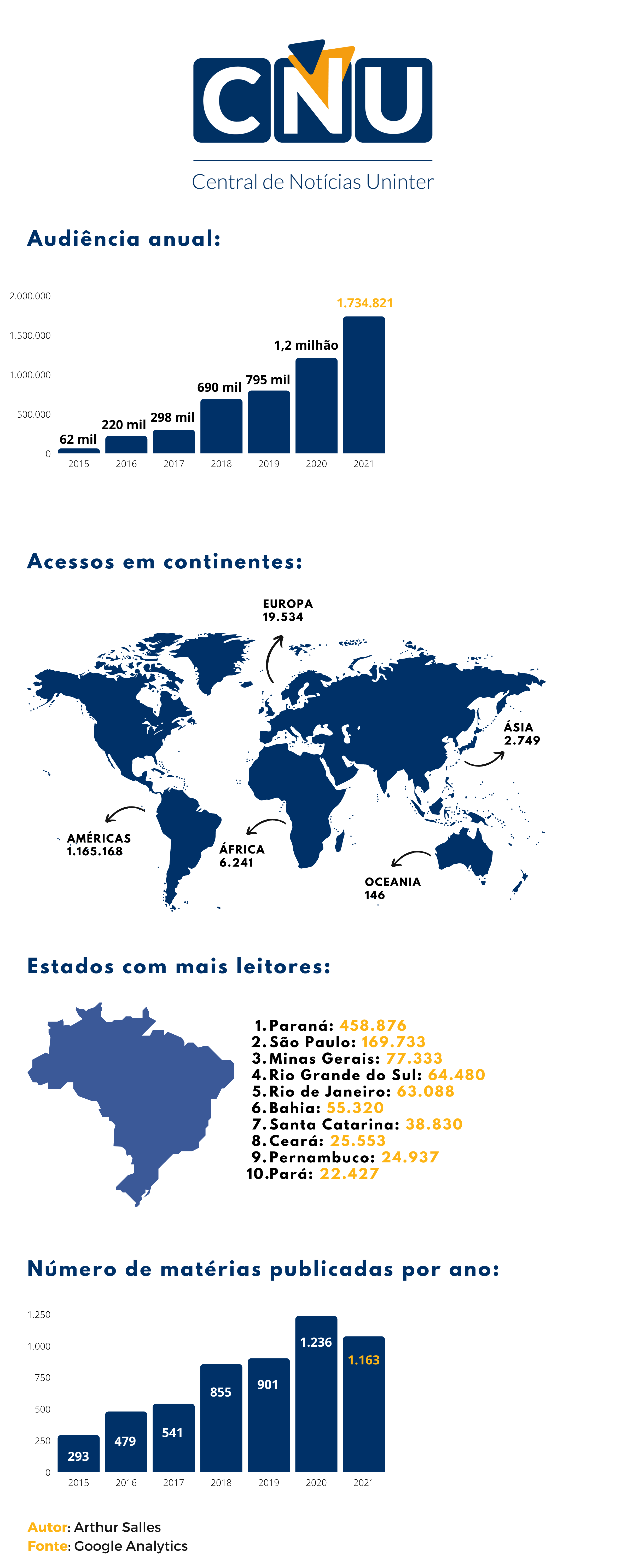 Quase dois anos de pandemia não impediram o crescimento da CNU (Central de Notícias Uninter) e sua produção de conteúdo. O site Uninter Notícias teve 1,7 milhão de páginas visualizadas e 1,2 milhão de usuários em 2021. Os números superaram os de 2020, aumentando em 43,5% a taxa de visualizações e em 79% o de público alcançado. Os indicadores seguem em crescimento exponencial ano a ano desde a fundação do portal, em 2012, que tem como missão veicular conteúdo de caráter educativo, cultural e informativo voltado aos interesses da comunidade Uninter.