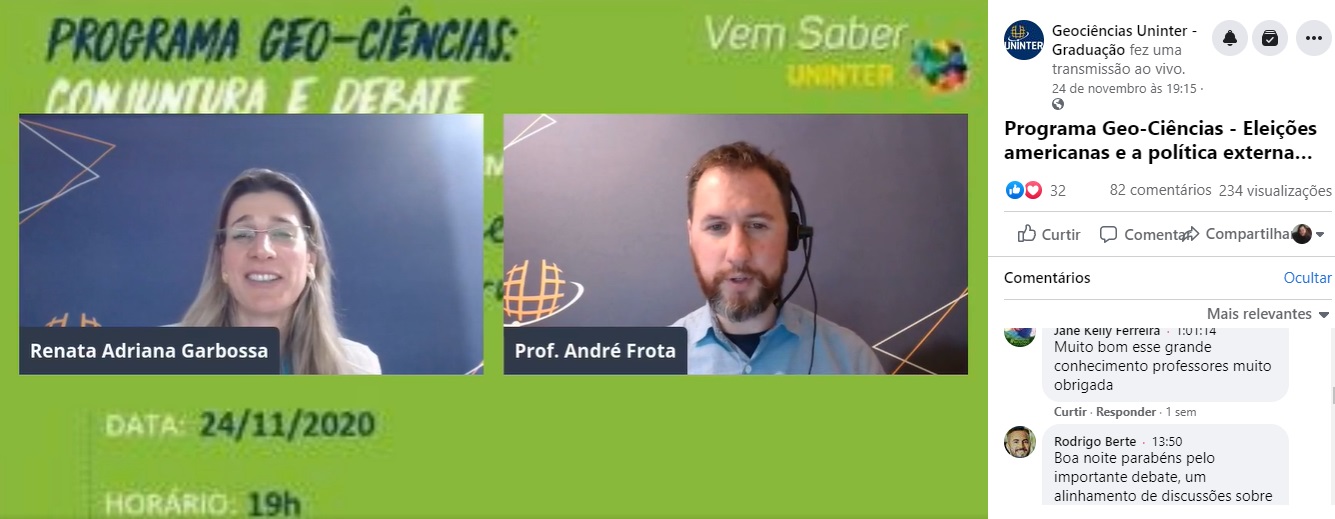 Frota debateu esses e outros pontos, como as questões ambientais e possíveis aproximações com outros países, durante o programa Geociências, Conjuntura e Debate, que teve o tema Eleições americanas e a política externa brasileira. O debate do dia 24.nov.2020 foi apresentado pela professora Renata Garbossa, coordenadora da área de Geociências da Escola Superior de Educação da Uninter.