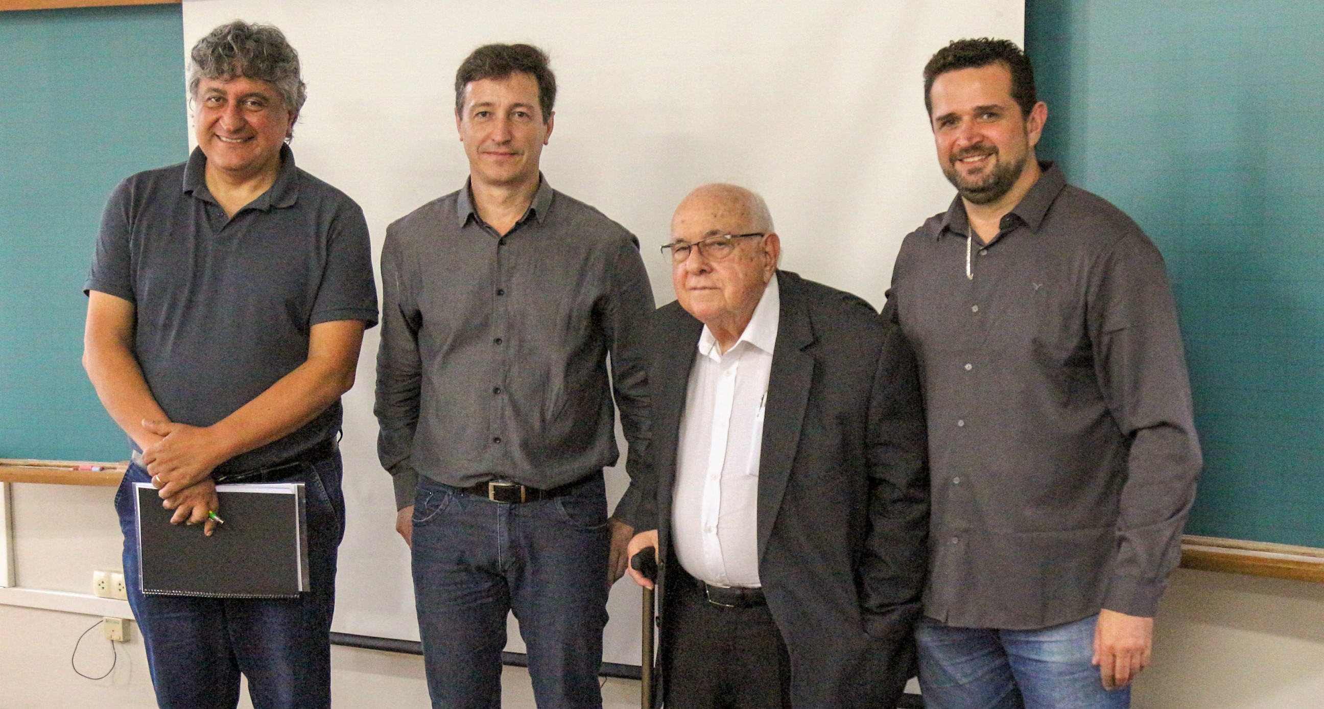 A banca era formada pelo orientador, o professor Luciano Frontino de Medeiros, o ilustre decano da Uninter, professor Alvino Moser, e também pelo professor Álvaro Emilio Leite, convidado da UTFPR. Eles ouviram atentamente a explanação de Álvaro sobre o desenvolvimento de experiências em sala de aula com alunos de ensino médio e superior.