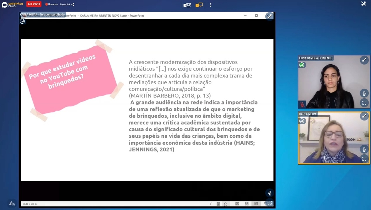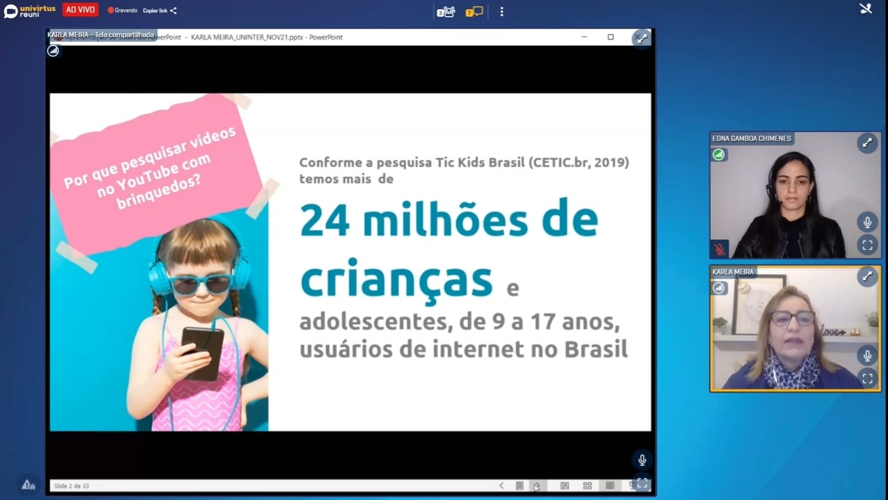A publicitária e pesquisadora da influência da mídia na identidade infantil Karla Meira abordou o tema na live transmitida pelo programa Vem Saber Uninter, transmitida pelo Univirtus e intitulada “YouTube e crianças: discurso e identidade”. O evento contou com a mediação da tutora dos cursos de pós-graduação de Comunicação da Uninter Edna Chimenes.