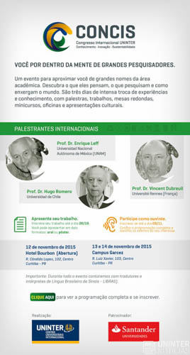 A palestra do ambientalista mexicano, Enrique Leff é um dos destaques do primeiro dia do Congresso Internacional de Conhecimento, Inovação e Sustentabilidade, realizado em Curitiba (PR), entre os dias 12 e 14 de novembro.