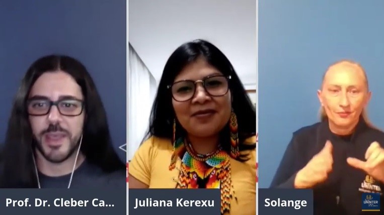 Fabiano Atenas e Juliana Kerexu foram os convidados da primeira noite do I Colóquio de Práticas da ESE, intitulado “Multiculturalismo: Relações étnico- raciais”, que aconteceu no dia 24.fev.2021. A abertura do evento foi realizada pelas professoras Deisily de Quadros e Cristiane Benvenutti, com a presença da professora Dinamara Machado, diretora da ESE. Os debates do primeiro e segundo blocos foram mediados pelo professor Cleber Cabral e continuam disponíveis para acesso na página de Linguagens e Sociedade e canal da ESE.