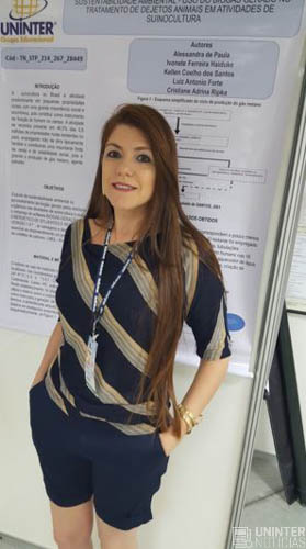 A coordenadora, Alessandra de Paula representou a Escola Superior de Gestão e Negócios da UNINTER com a apresentação do painel Sustentabilidade Ambiental – uso do Biogás gerado no tratamento de dejetos animais em atividades de Suinocultura.