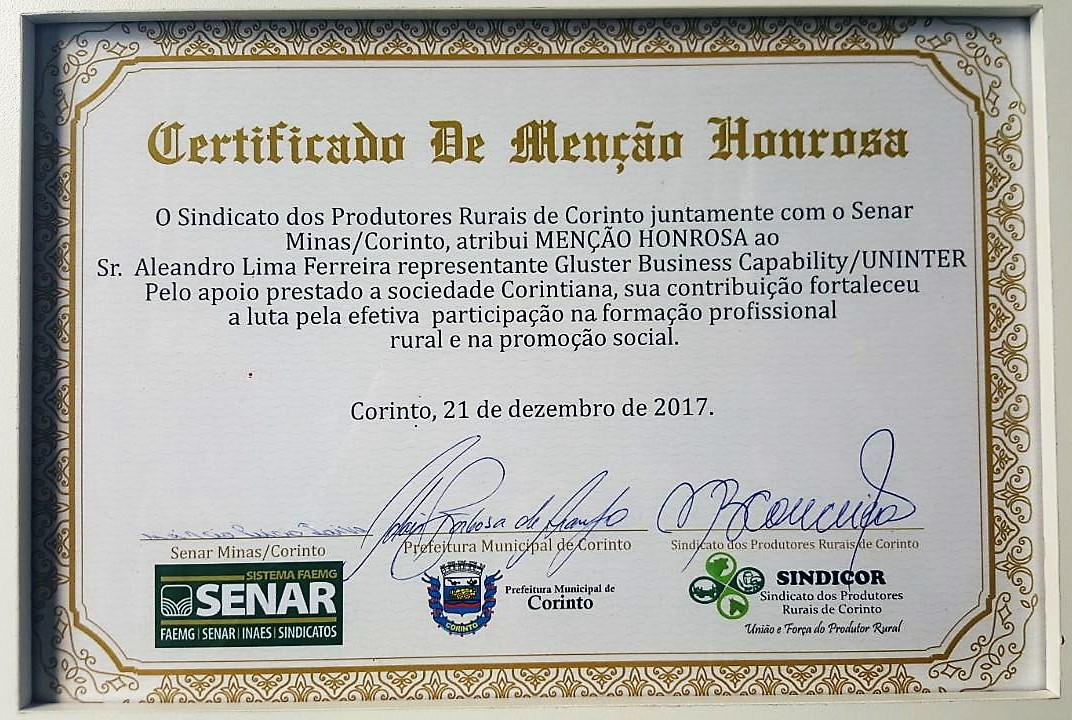 A busca para adquirir conhecimento é uma das principais metas de milhares de pessoas. Nisso, prestar ajuda ou apoio para que esse sonho se realize torna-se fundamental.  E é esse incentivo que os colaboradores do polo de apoio presencial (PAP) da Uninter na cidade de Corinto (MG) estão levando para a população. Em retribuição, o polo recebeu no dia 21 de dezembro de 2017 um certificado de Menção Honrosa.