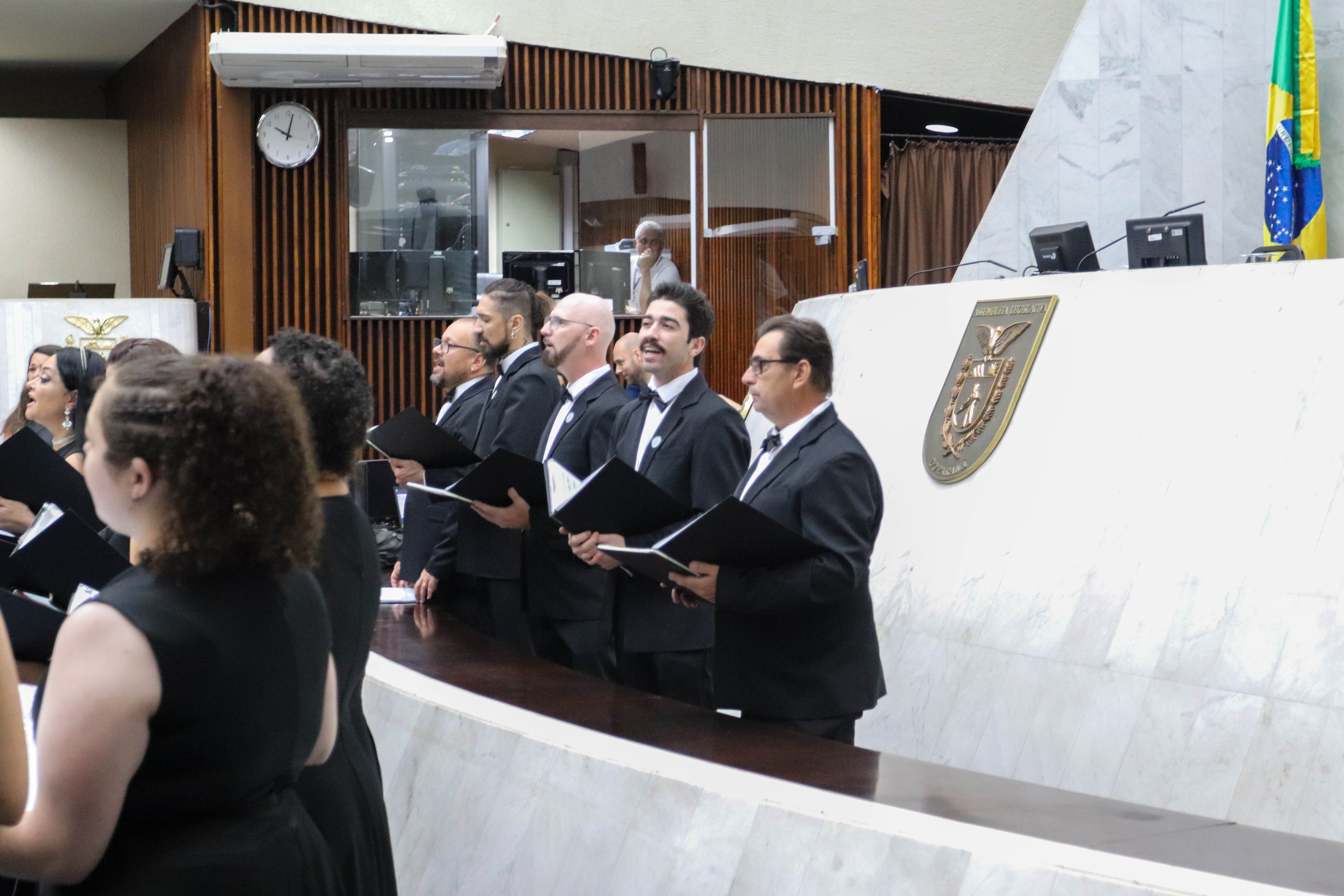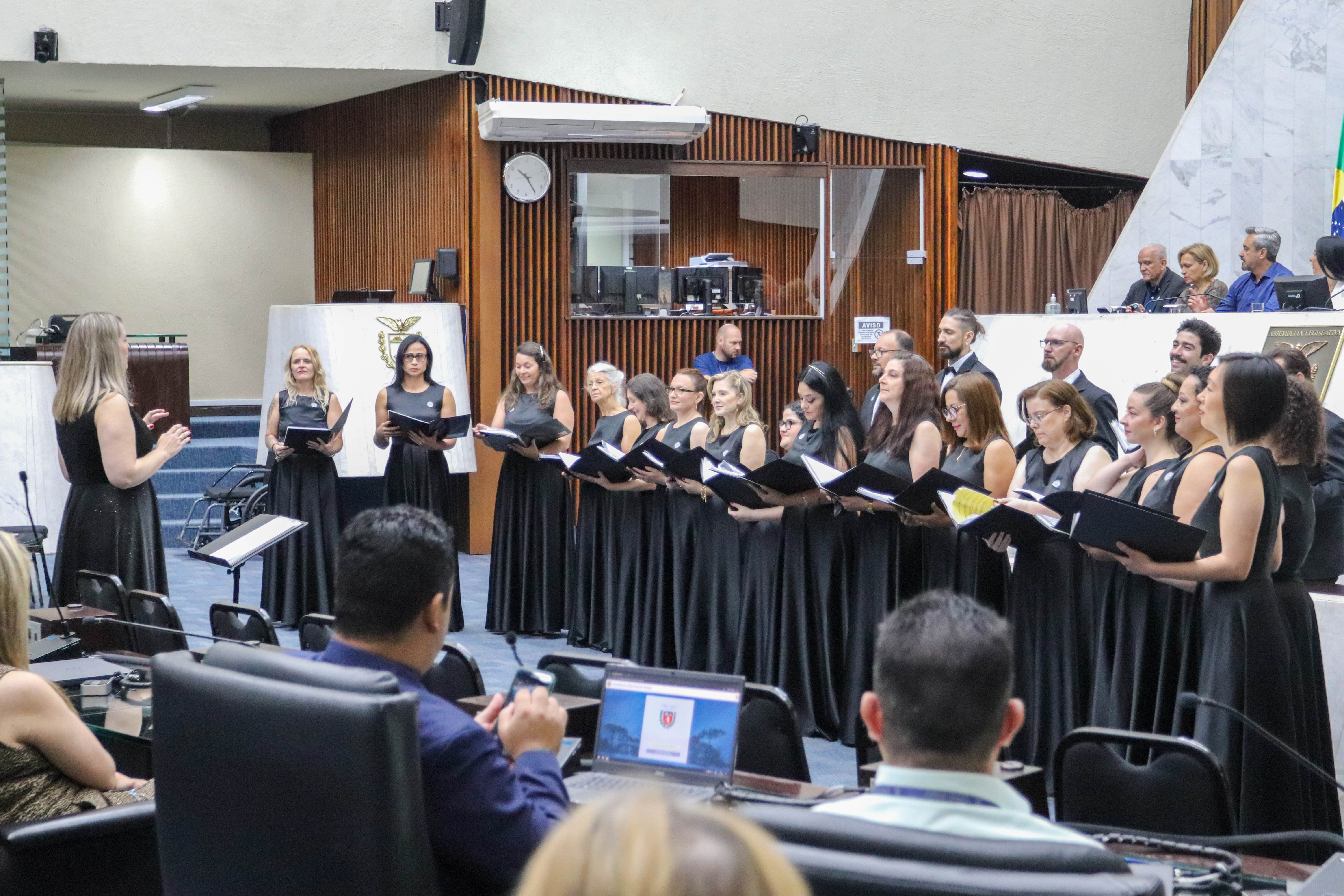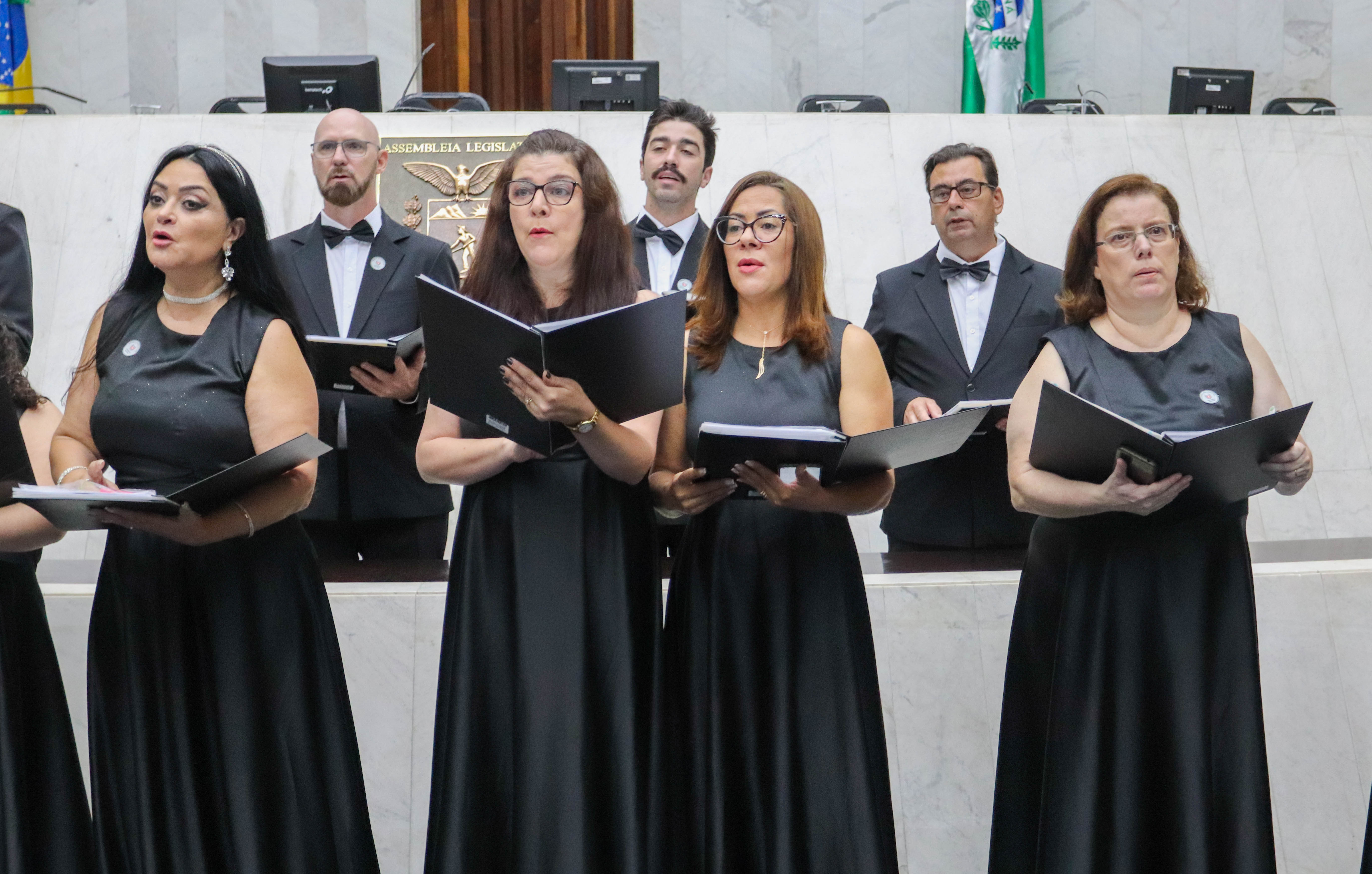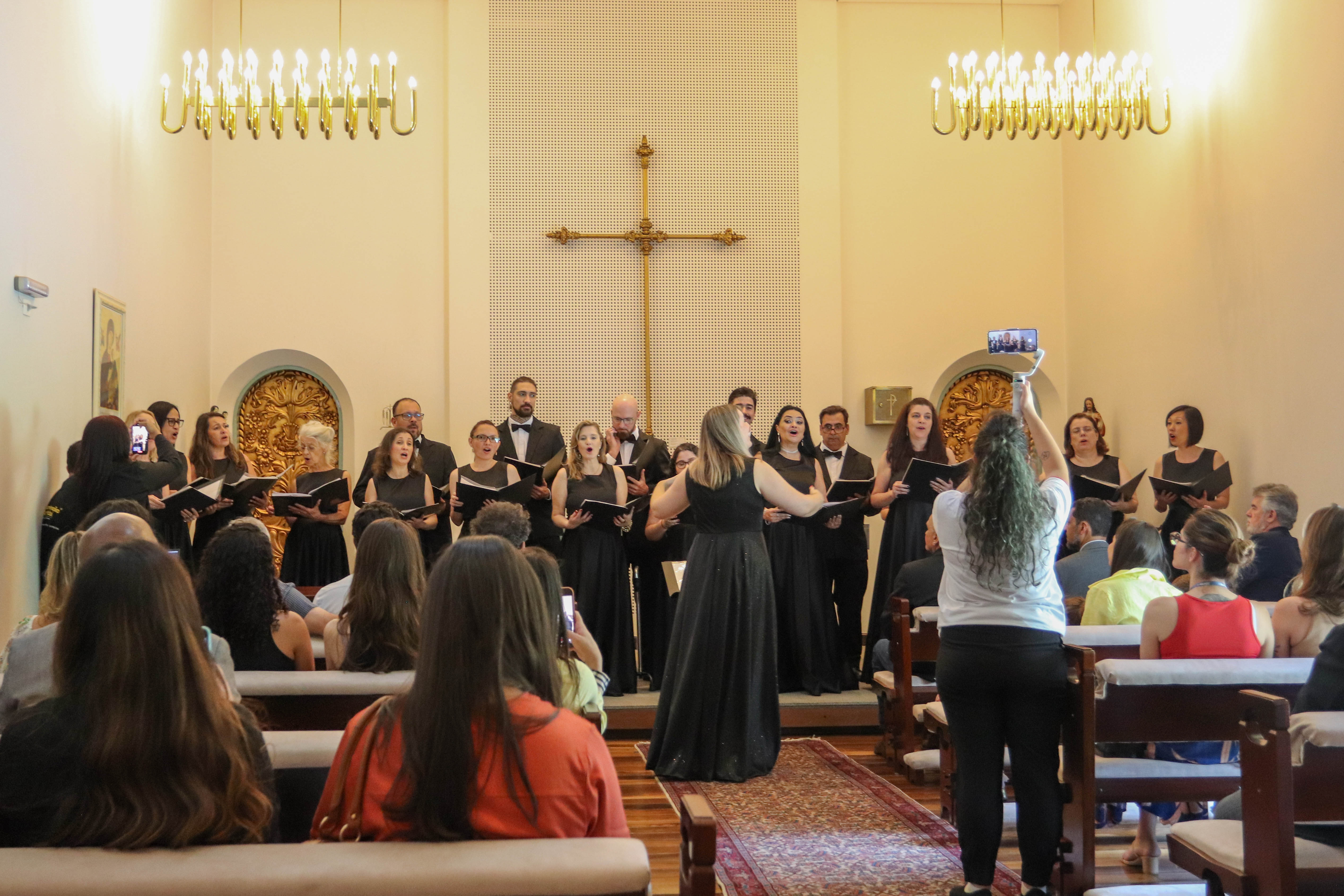 O plenário da Assembleia Legislativa do Paraná (Alep) e a capela do Palácio Iguaçu, em Curitiba (PR), foram cenários das últimas apresentações de Natal do Coro Margareth Picler em 2024. A convite do deputado Alexandre Amaro e do bispo Cirino Ferro, o grupo se apresentou no Culto de Ação de Graças em celebração ao encerramento do ano legislativo, com participação do coordenador da área de Humanidades da Uninter, Cícero Bezerra.