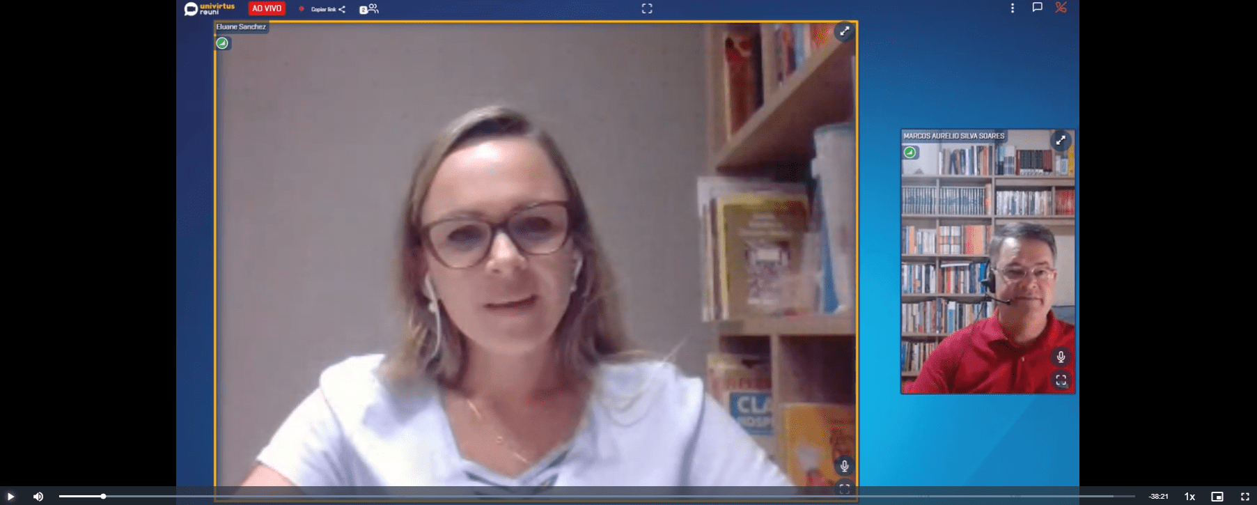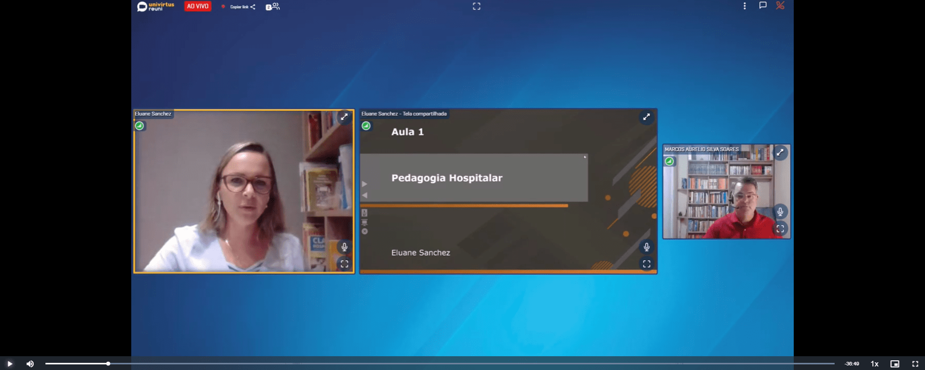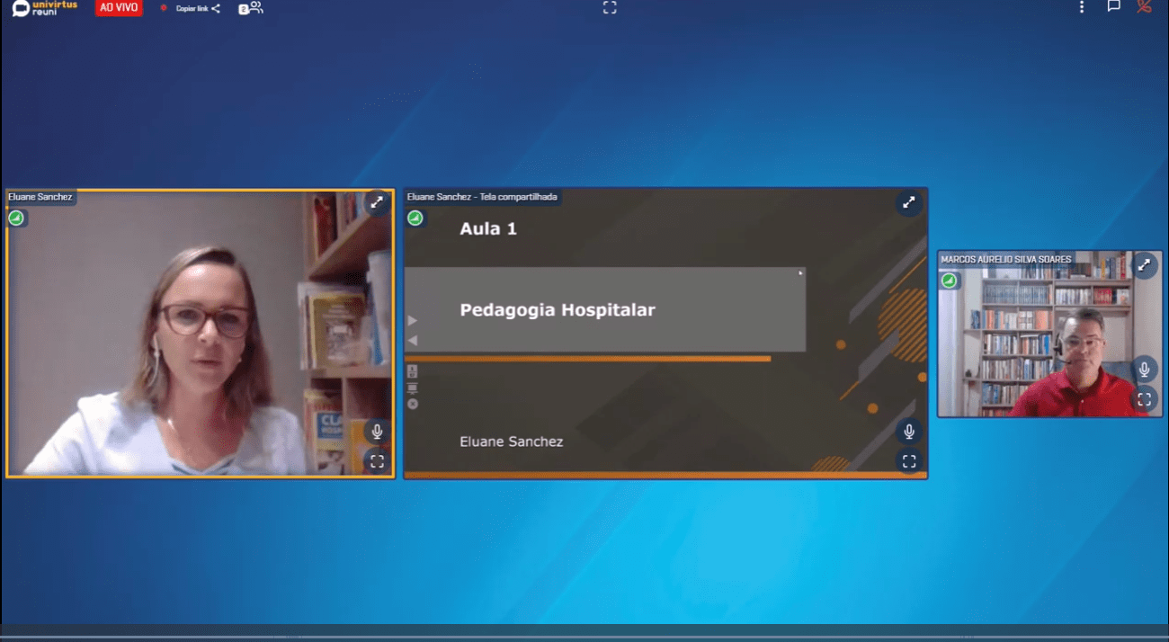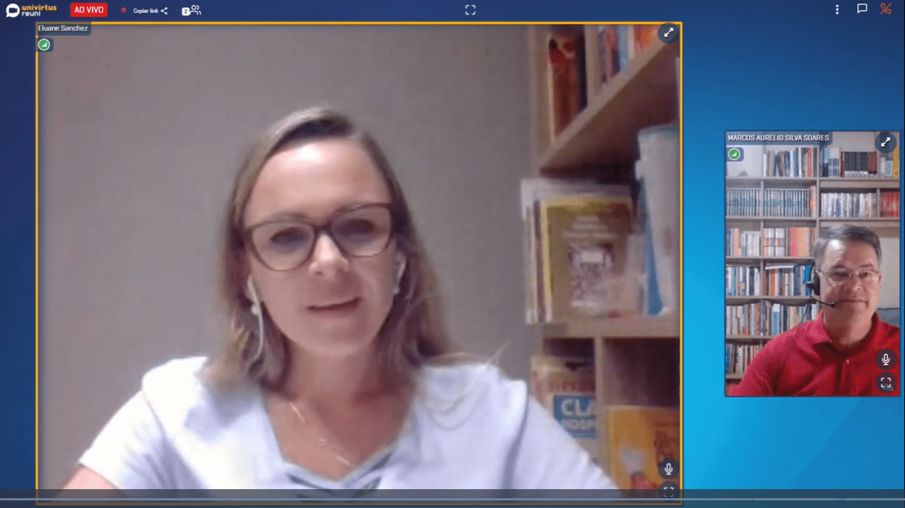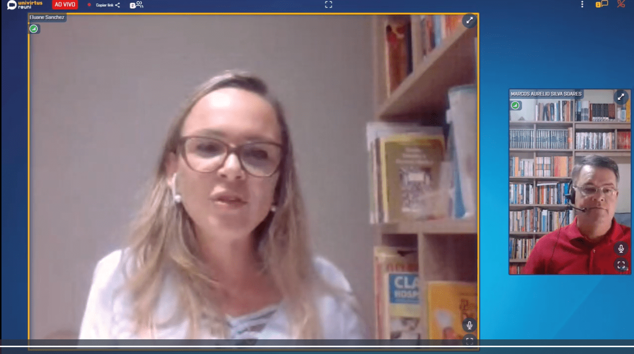 O coordenador do curso de pós-graduação em Pedagogia Hospitalar da Uninter, Marcos Aurélio Silva Soares, entrevistou Eluane Mirian Santos Sanchez no evento intitulado “Pedagogia Hospitalar – Compromisso e desafios da educação no contexto da saúde”. A conversa, que aconteceu em 10.fev.2021, abordou práticas atuais que envolvem a profissão da pedagogia e foi transmitida no AVA (Ambiente Virtual de Aprendizagem).