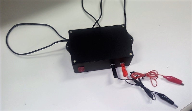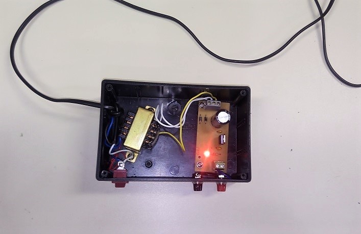 A placa de circuito de fonte linear foi montada em uma caixa, o que disponibilizou as saídas por meio de conectores, ficando com a aparência de um produto comercial.