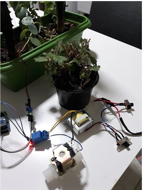 O projeto consiste em um sistema microcontrolado baseado em Arduíno, que mede a temperatura ambiente e a umidade do solo por meio de sensores, determinando momentos de acionamento de uma válvula que libera água para irrigação de uma planta.