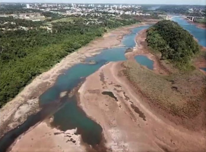 * Na foto, o leito quase seco do Rio Paraná, na fronteira entre Foz do Iguaçu (Brasil) e Ciudad del Este (Paraguai).