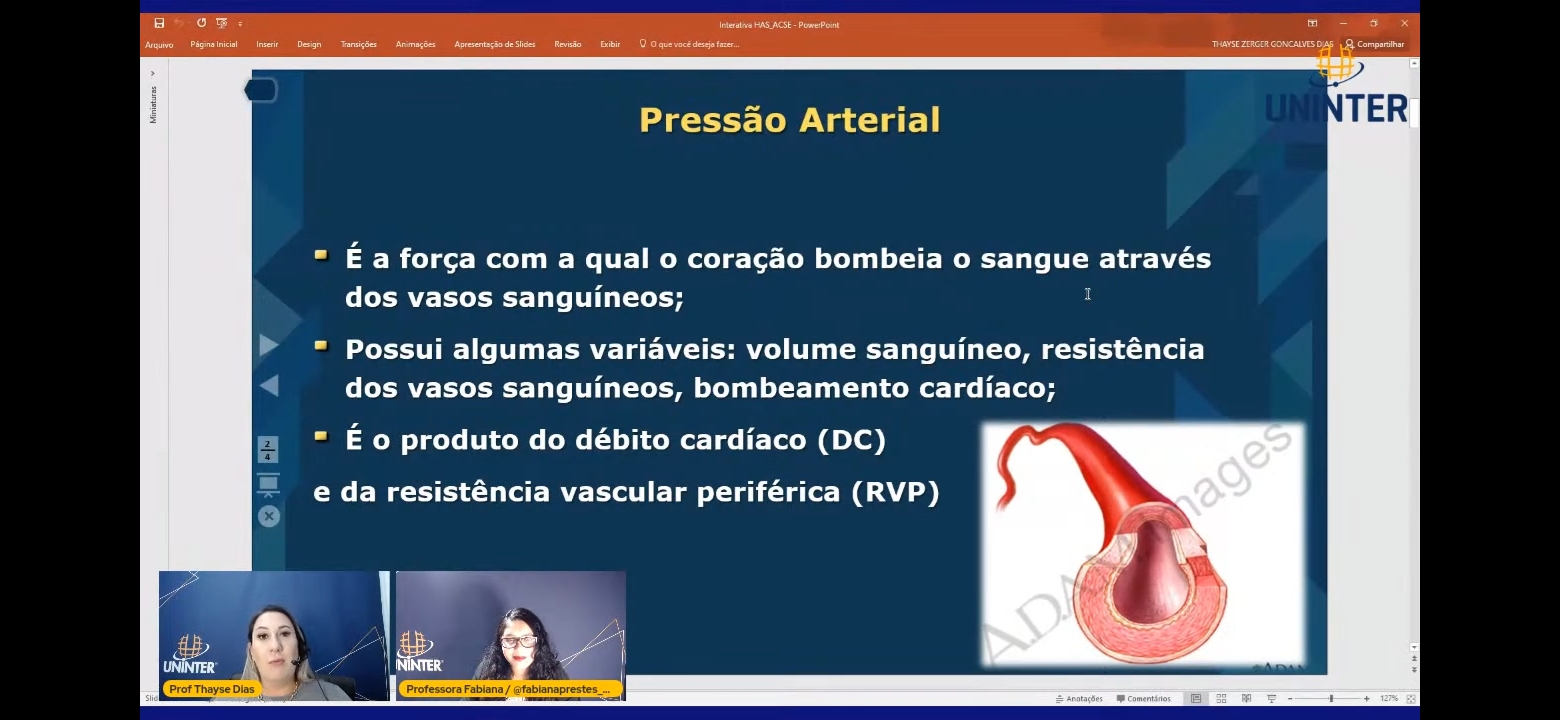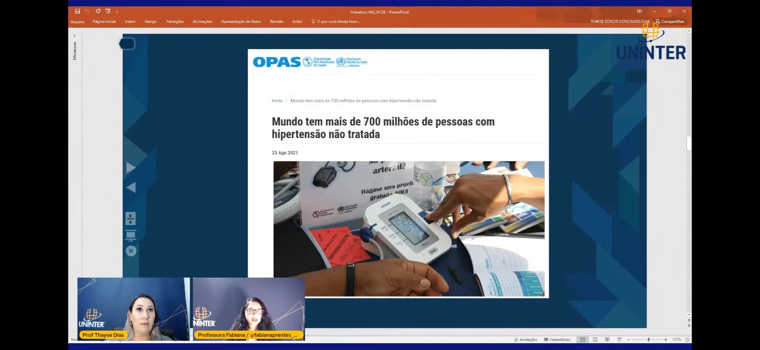 Thayse Dias participou da live intitulada “Hipertensão Arterial Sistemática”, promovida pela Escola Superior de Saúde Única da Uninter. A transmissão teve a mediação de Fabiana Prestes, professora do curso de Gerontologia da Uninter, e pode ser assistida na íntegra nesse link.