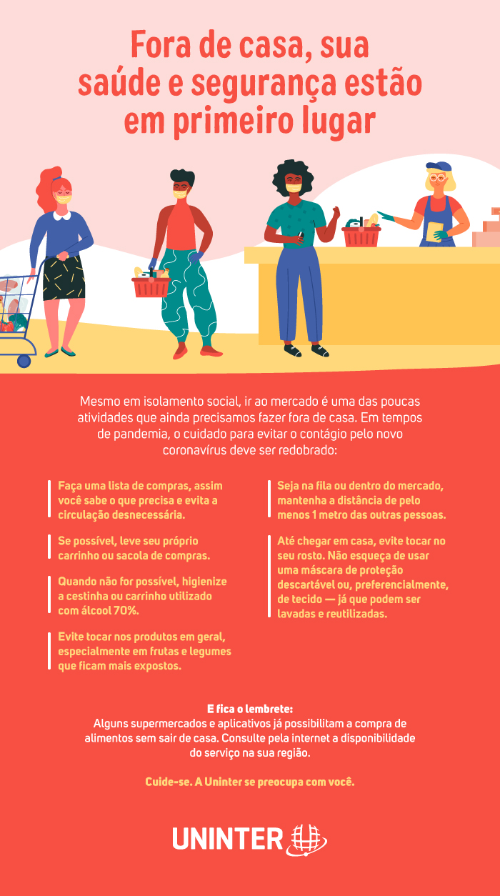 A Uninter tem feito com frequência campanhas internas, via e-mail e outros canais digitais, para alertar os seus colaboradores sobre a importância do distanciamento social como forma de assegurar a saúde e o bem-estar de todos diante da pandemia do Covid-19. Uma destas campanhas lembra que, mesmo em isolamento social, ir ao mercado é uma das poucas atividades que ainda precisamos fazer fora de casa.
