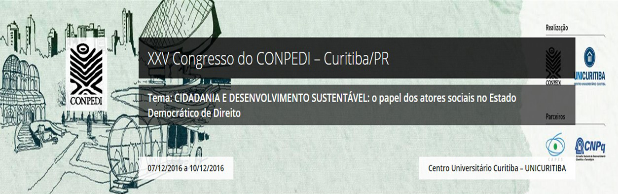 Curitiba sediará de 7 a 10 de dezembro o maior evento de pós-graduação em Direito do Brasil, o 25º Congresso do CONPEDI. Promovido pelo Conselho Nacional de Pesquisa e Pós-Graduação em Direito, o evento terá como temática Cidadania e Desenvolvimento: O papel dos atores no Estado Democrático de Direito. Participarão do encontro acadêmicos e profissionais de todo o país.