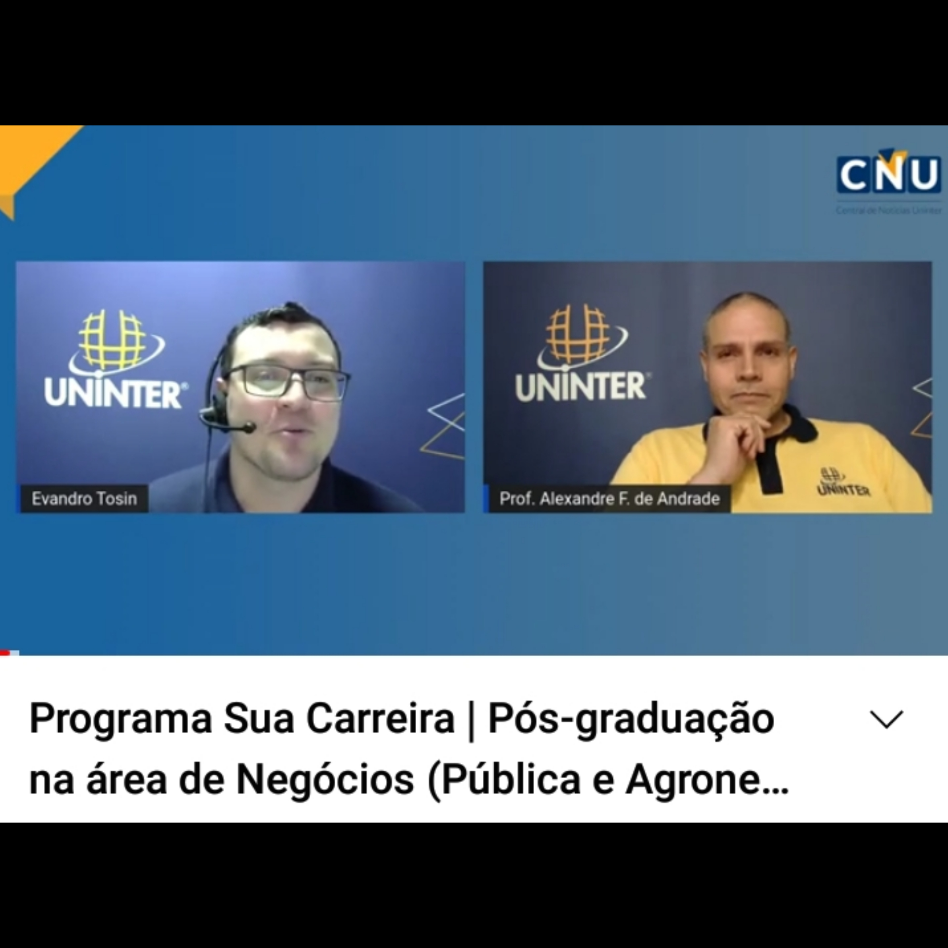 O programa Sua Carreira, exibido no dia 16.jul.2021 pela Rádio Uninter, trouxe como tema a apresentação dos cursos na área de negócios, e abordou três cursos de pós-graduação que podem oferecer boas oportunidades de crescimento profissional no momento. Com a mediação de Evandro Tosin, o programa recebeu o professor e coordenador de pós-graduação na área de negócios, Alexandre de Andrade, que apresentou três cursos: Contabilidade Pública e Responsabilidade Fiscal, Gestão Financeira no Setor Público e Gestão Financeira no Agronegócio.