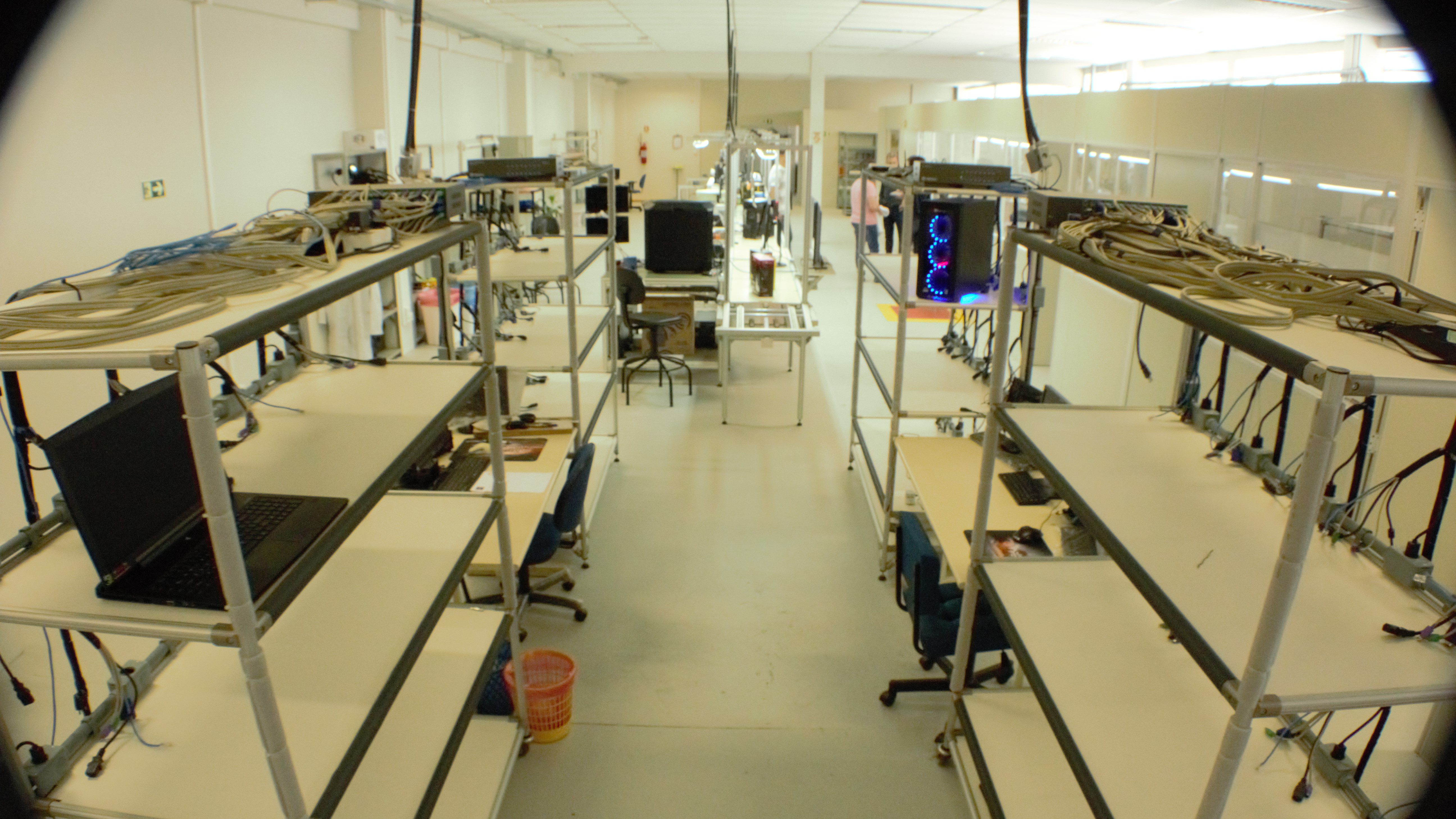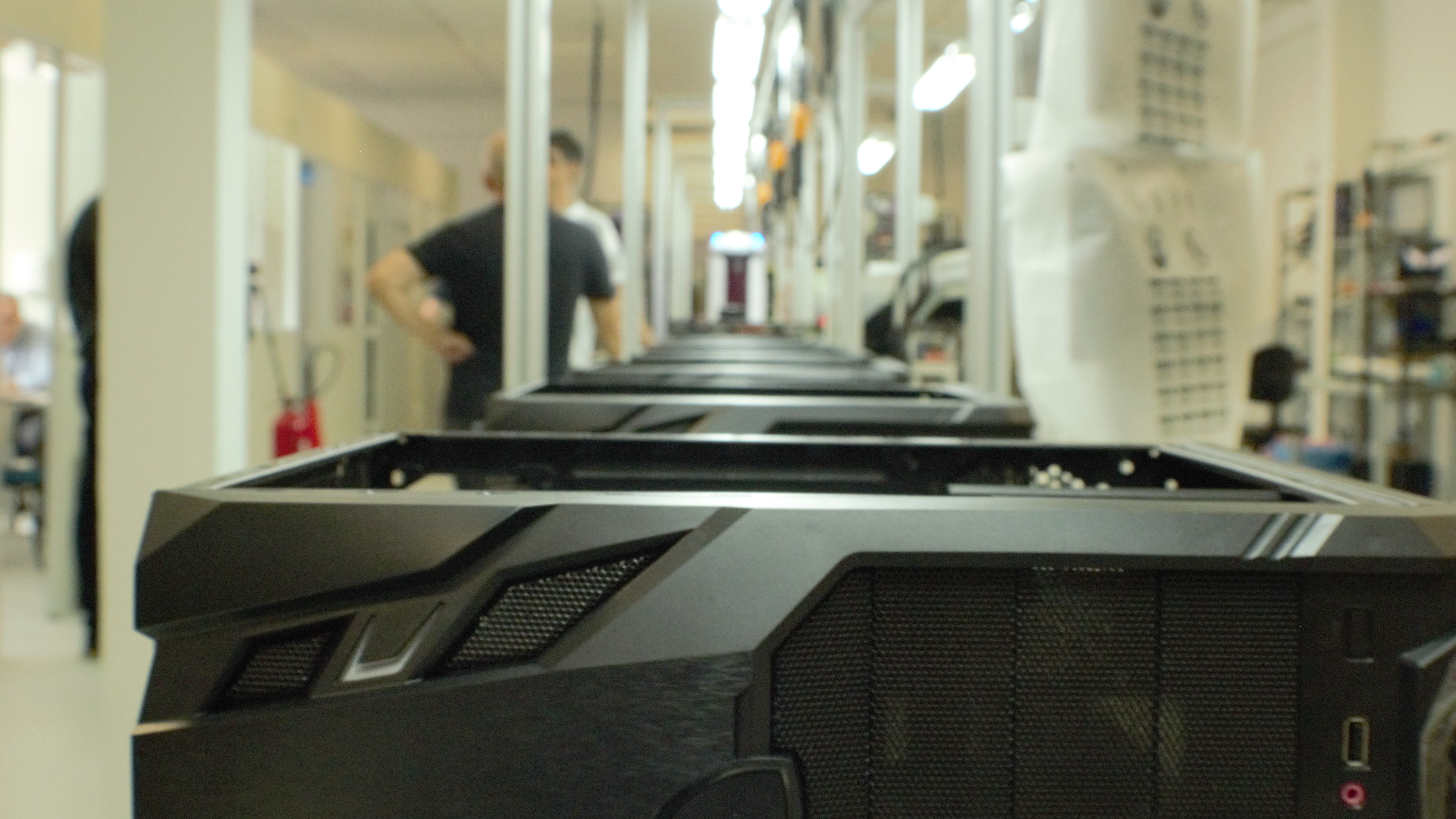Os notebooks gamers são muito delicados e possuem montagem complexa. São trazidos já prontos da China. Ao chegarem na fábrica, ficam por 24 horas em teste para só depois serem colocados à venda. Já na linha de desktop, são importados os periféricos, que são todos os equipamentos e acessórios que compõem o aparelho, depois montados na fábrica. Cássio explica que são colocados todos os periféricos até chegar no final da linha a instalar o Windows.