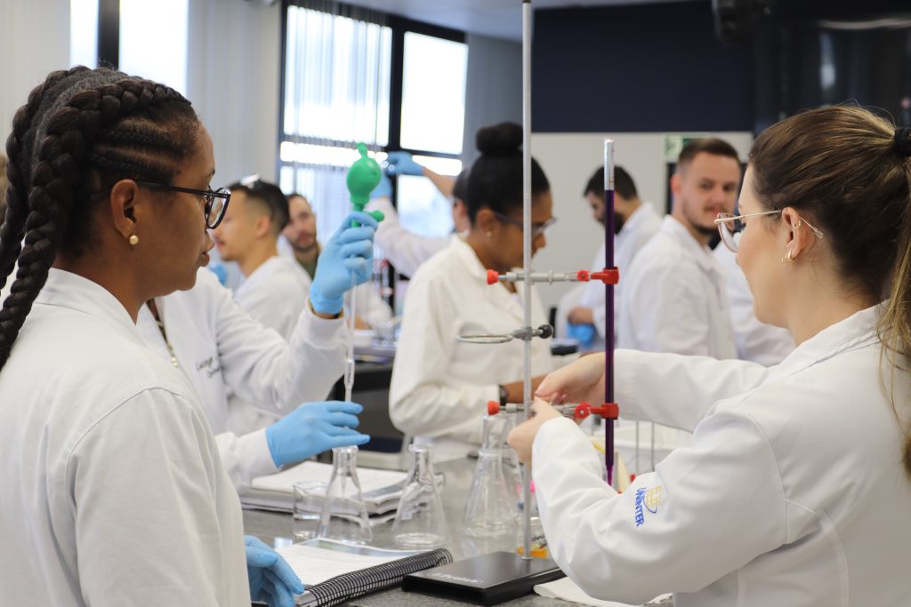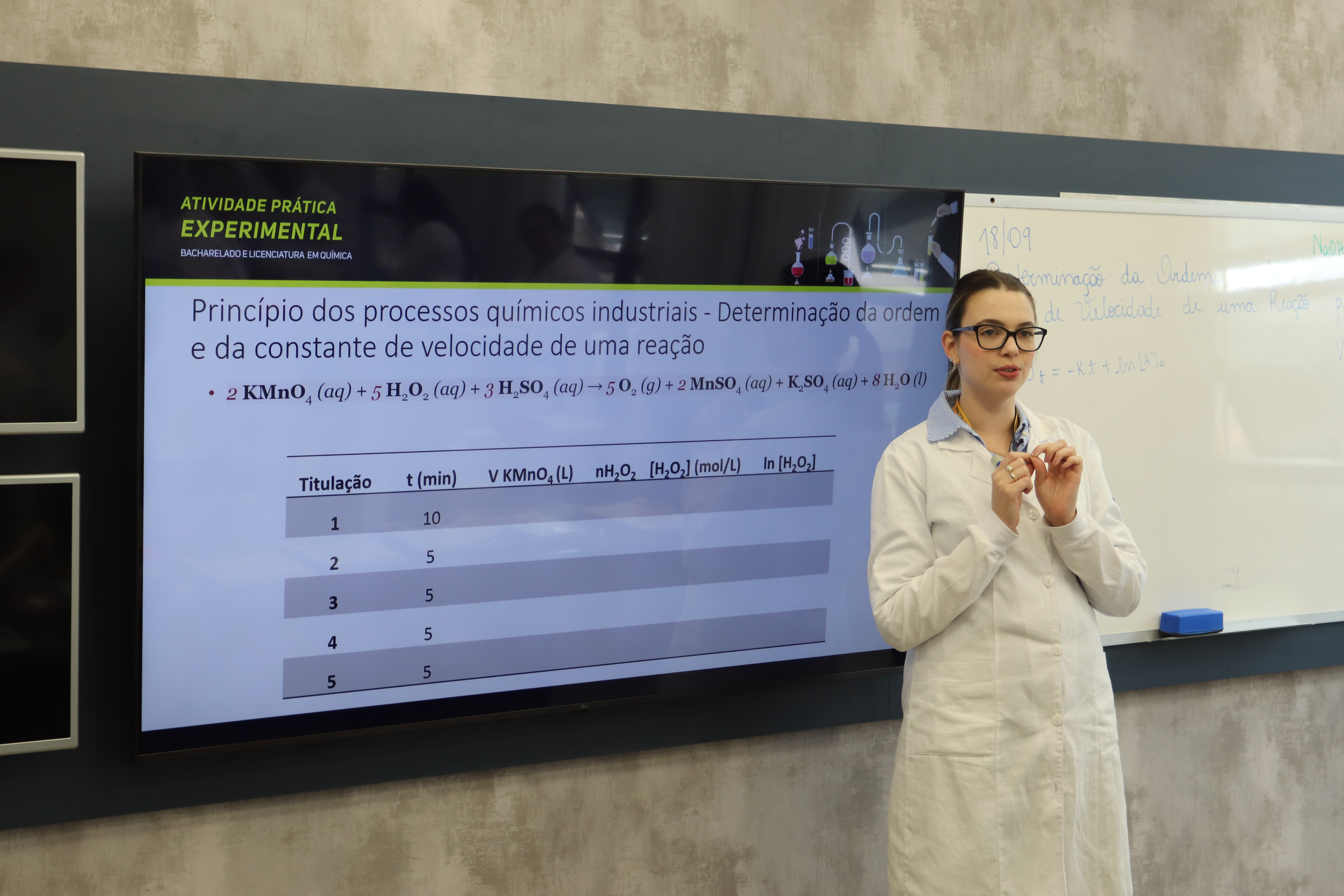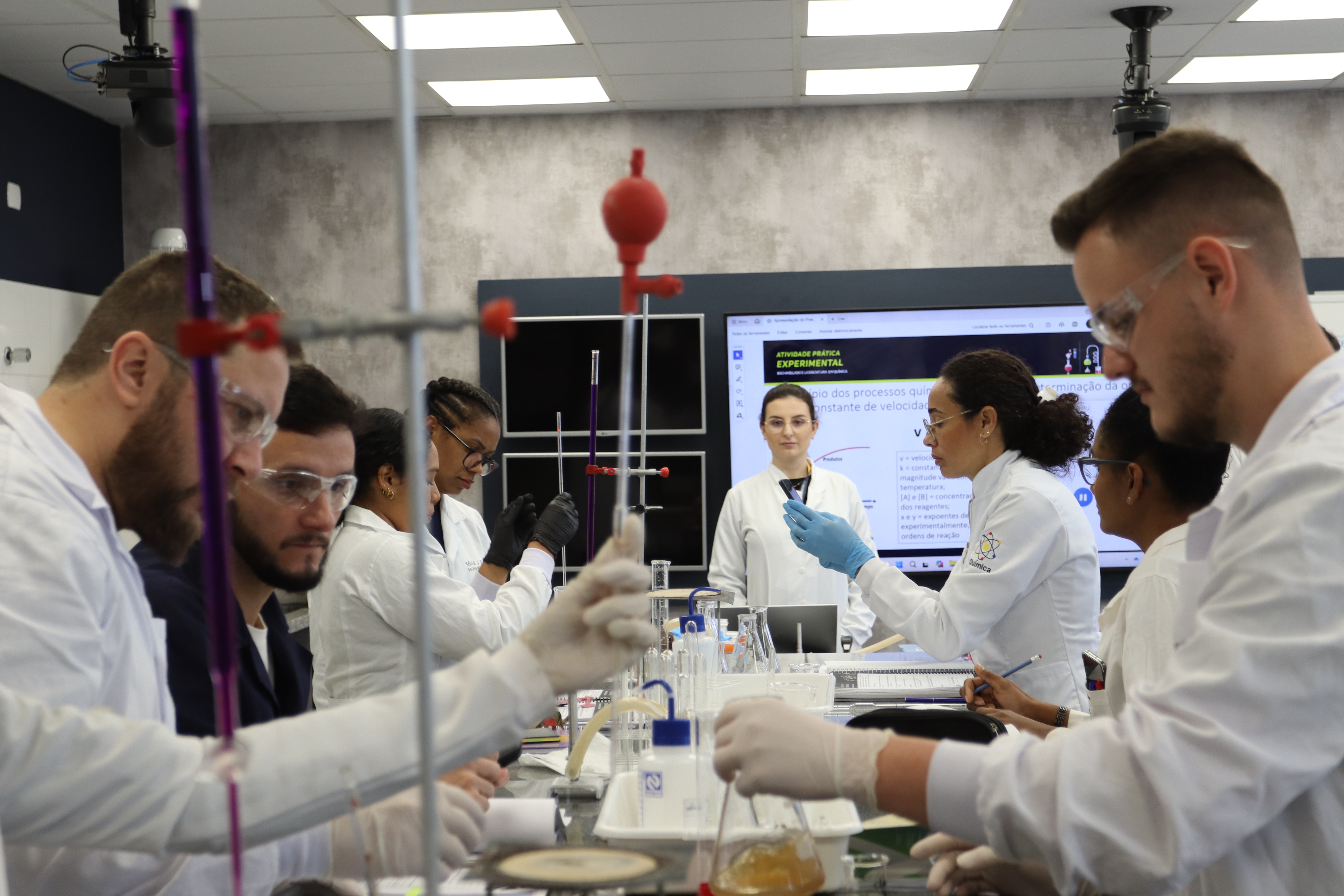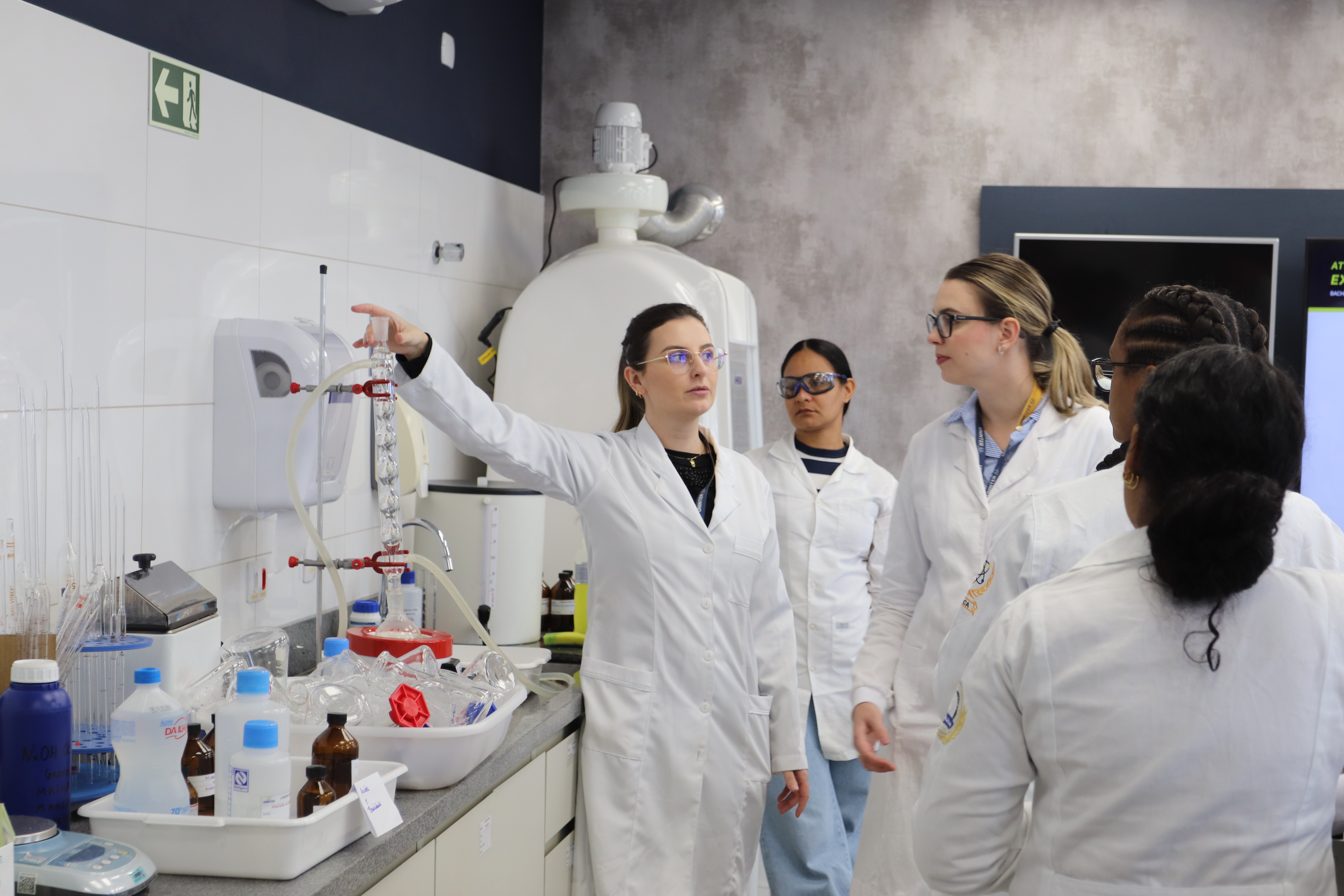 A introdução à vivência em laboratórios é um dos pontos de destaques da aula, como destaca a professora e coordenadora de laboratório, Gabriele Dupont. “A partir do terceiro ano do curso, o aluno tem que se organizar para fazer essa imersão no laboratório, onde eles aprendem a manusear as vidrarias, a trabalhar com os reagentes químicos, ácidos, bases, substâncias orgânicas e realizar diversos experimentos desde o início, para conhecer as normas de segurança de um laboratório onde eles vão trabalhar”, explica Dupont.