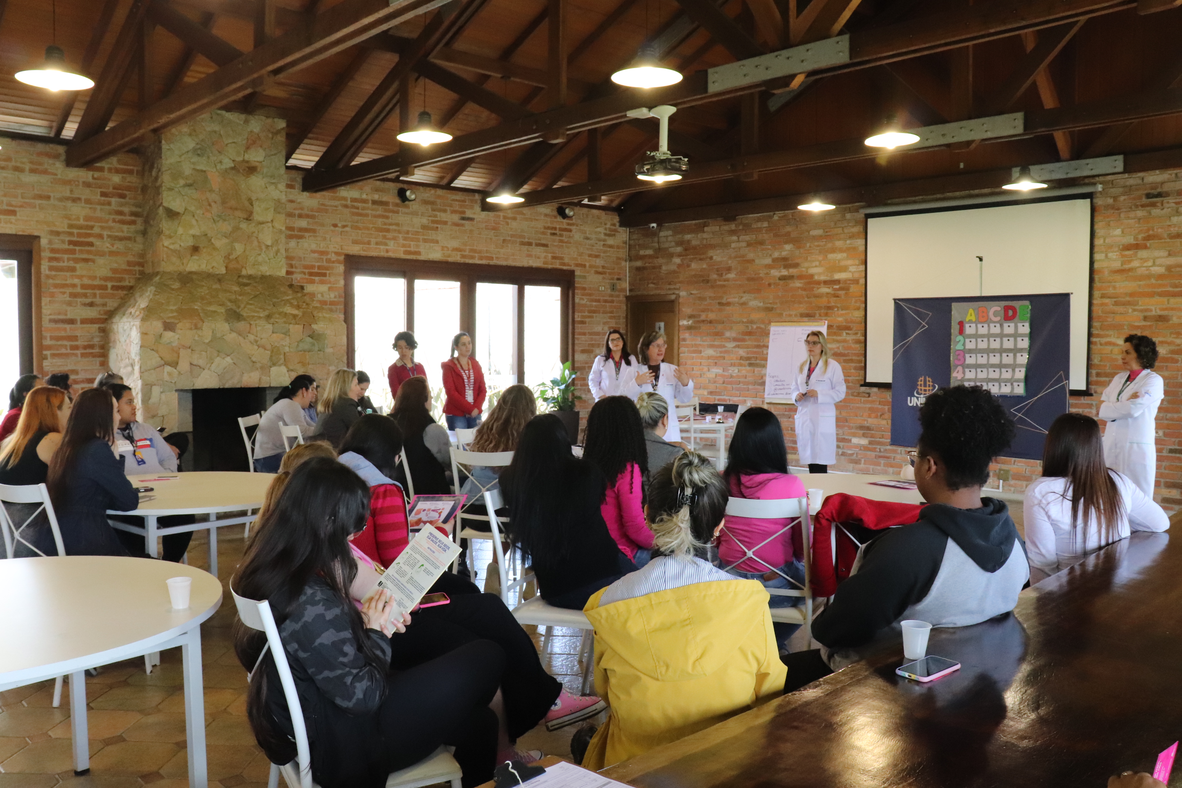 Um evento especial promovido pelo setor de Gestão de Pessoas, em parceria com a ESSU, foi realizado entre os dias 19 e 20 de outubro, contemplando todas as sedes. A mulherada compareceu, e pôde aprender sobre o câncer de mama por meio de uma abordagem leve e lúdica, abordada pelos professoras Louise Aracema Scussiato, Deisi Cristine Forlin Benedet, Maria Caroline Waldrigues e Ivana Busato, que em um jogo de batalha naval levaram informações e propuseram desafios para as participantes.