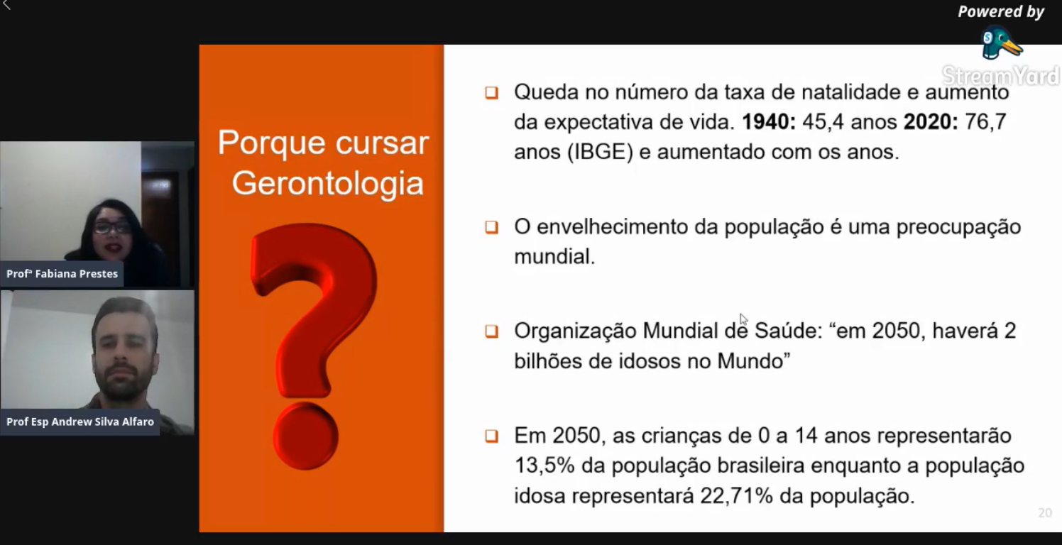 Essas informações foram compartilhadas na última live da Maratona Para Desenvolvimento Sustentável Uninter, na qual os professores Andrew Silva Alfaro (tutor do curso de Práticas Integrativas Complementares da Uninter) e Fabiana Prestes (do curso tecnólogo de Gerontologia da instituição) falaram sobre o tema e sobre a profissão de gerontólogo. A apresentação foi realizada pela professora Patrícia Rondon.