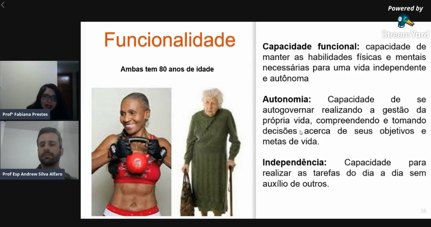 Além disso, os professores também apresentaram alguns conceitos que são aplicados na área: O biológico (que corresponde as alterações do organismo durante o processo de envelhecimento), o social (onde o idoso está inserido), o cultural (a cultura ligada a ele e as diferentes culturas presentes na sociedade), o espiritual (aquilo que é sagrado para o idoso), educacional (que abrange as informações, o conhecimento e o aumento da qualidade de vida), e o psicológico (relacionado ao cognitivo, afetivo e emocional).