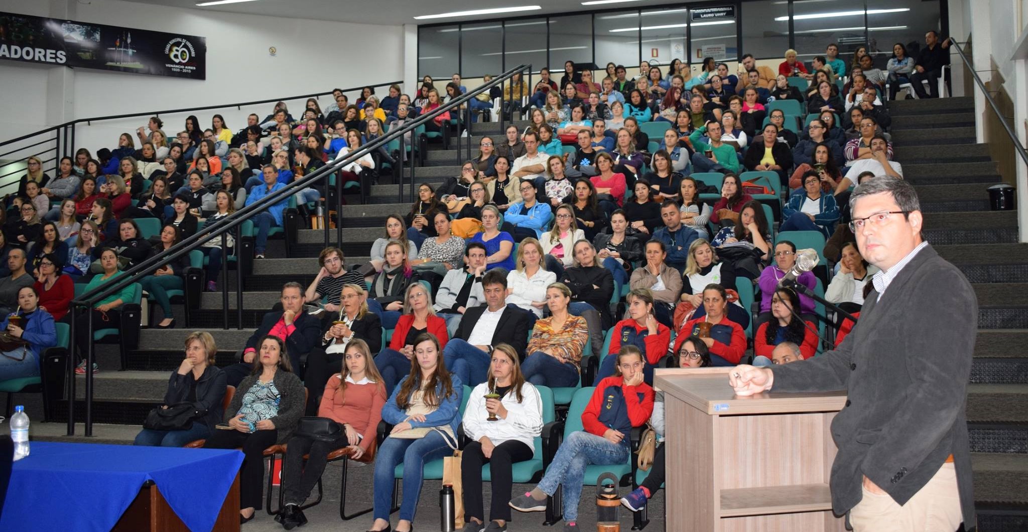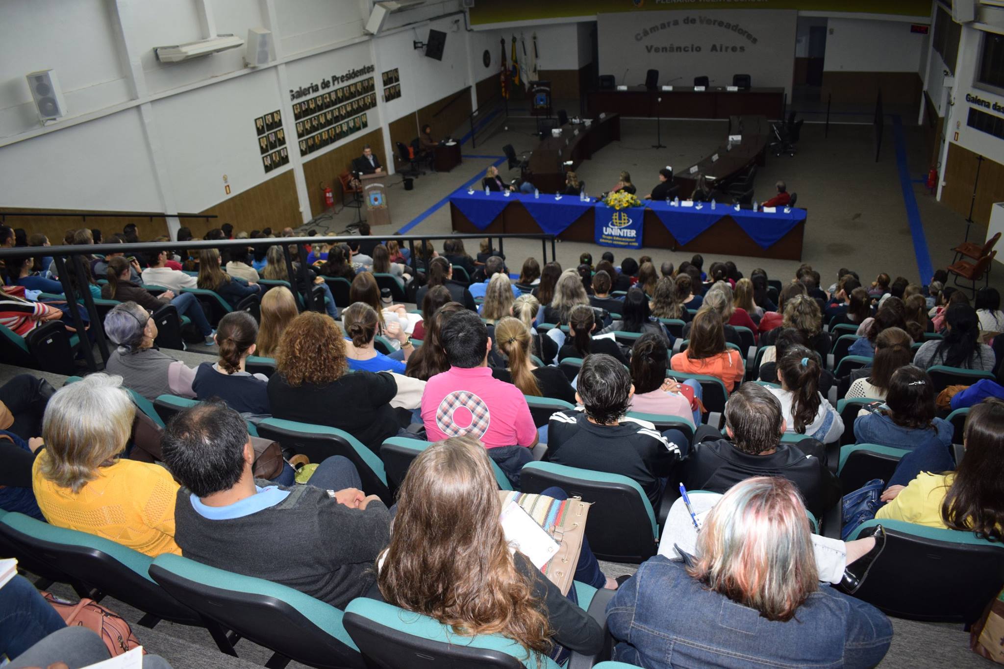 A noite chuvosa desta quinta-feira (14) não foi empecilho para mais de 260 pessoas que lotaram as dependências da Câmara de Vereadores de Venâncio Aires (RS), durante a 5ª Mostra de Responsabilidade Social promovida pelo polo local da Uninter. O público acompanhou atentamente os relatos de seis especialistas que falaram sobre suas experiências com o “Transtorno do Espectro Autista”, ou simplesmente autismo.