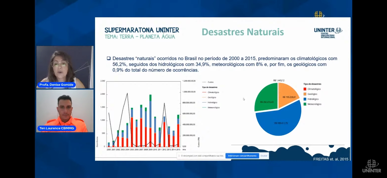 A relação entre recursos hídricos e os desastres naturais foi um dos temas abordados durante a Supermaratona Uninter “Terra – planeta água”, que promoveu uma série de palestras ocorridas entre 18 e 19 de março e debateu assuntos de grande relevância para a saúde do nosso planeta. Denise Ferreira Gomide Batista, especialista da área de enfermagem, e Laurence Silva, tenente do Corpo de Bombeiros de MG, falaram sobre tragédias envolvendo barragens, ocorridos nos últimos anos no Brasil.