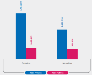 Outro dado que indica o crescimento feminino na área está relacionado à educação. De acordo com o mapa do ensino superior no Brasil 2024, realizado pelo Instituto Semesp, representado pelo gráfico (figura 2), houve um crescimento de 7,4% nas matrículas de alunas em IES da rede privada entre 2021 e 2022. No mesmo período, na rede pública esse aumento foi de apenas 0,6%. O aumento das matrículas entre homens na rede privada no mesmo período foi de 5,5% (queda de 0,9% nas IES públicas). Em relação à distribuição das matrículas entre homens e mulheres, há uma estabilidade ao longo dos anos, com a participação feminina sempre superando a masculina.