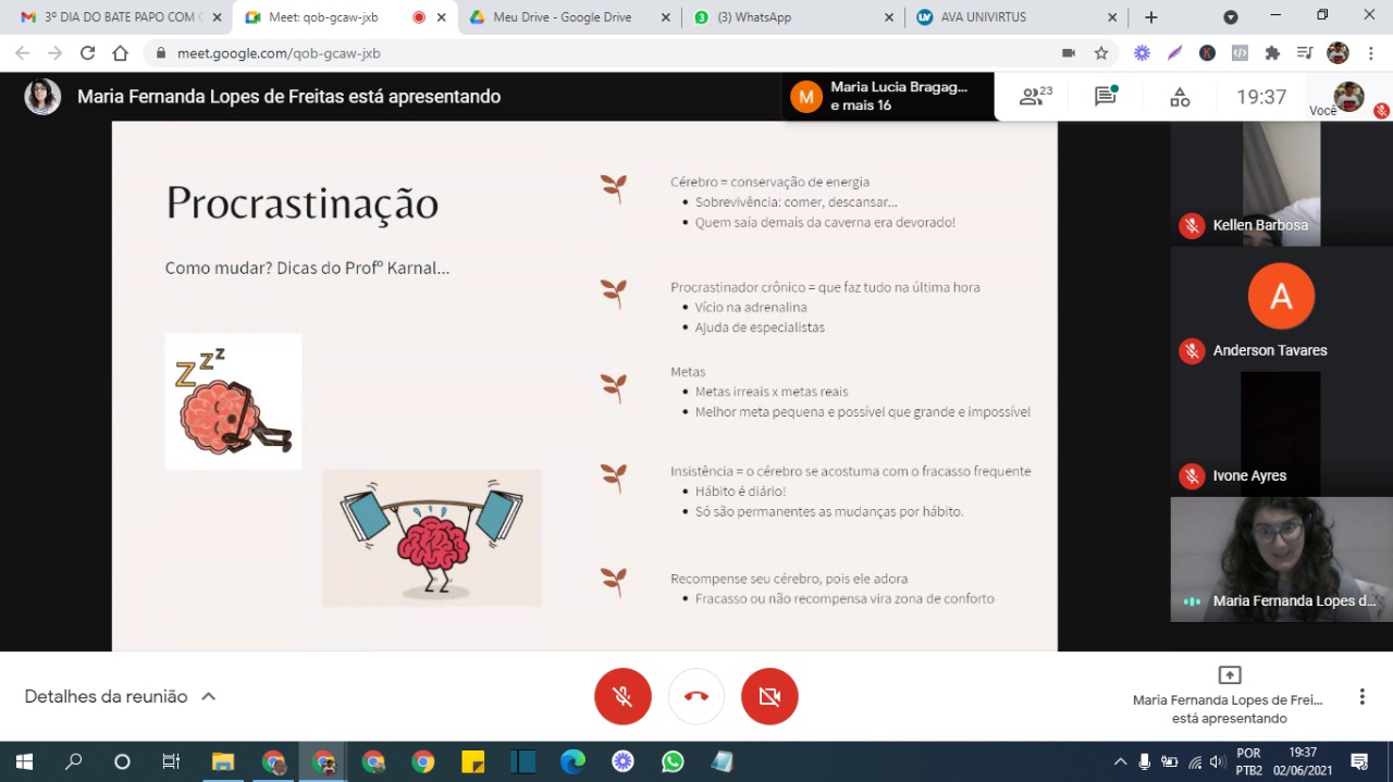 O terceiro e último dia do evento “Bate-Papo com o Polo Garcez” debateu exatamente as estratégias para driblar a procrastinação. O evento contou com a participação das professoras Ketlyn Sabadini e Maria de Freitas, da psicóloga e orientadora educacional Cristina Barros, da assistente social Simone Fernandes e do professor Paulo de Brito.