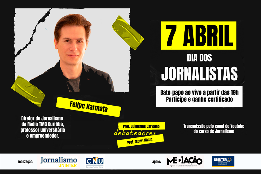O curso de Jornalismo da Uninter, em parceria com a Central de Notícias Uninter (CNU), realiza um bate-papo com Felipe Harmata. A atividade será realizada no dia 7 de abril (Dia dos Jornalistas), com transmissão ao vivo pelo canal do curso no Youtube. A conversa inicia 19 horas e será mediada pelos professores Guilherme Carvalho e Mauri König.