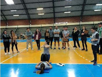 Alunos do curso de Educação Física de educação a distância do polo da Uninter em Tubarão (SC) realizaram no dia 2 de junho aulas de campo das disciplinas “Medidas e Avaliação” e “Voleibol”. Realizada num domingo, a prática contou com 19 acadêmicos e teve a primeira parte da aula pela manhã, com os estudantes realizando testes de aptidão física em duplas, em que um aluno fez o papel de avaliador e o outro de avaliado.