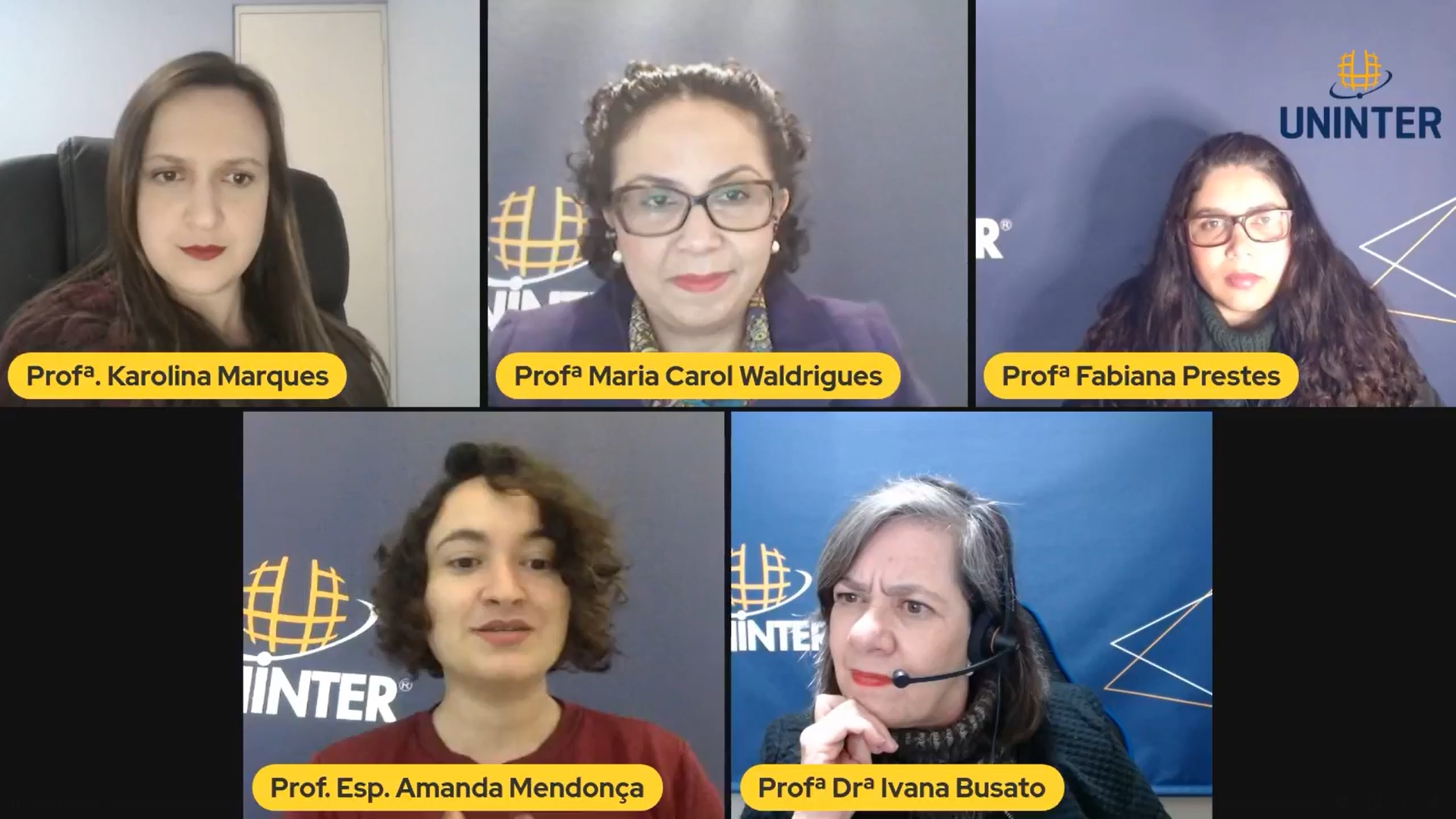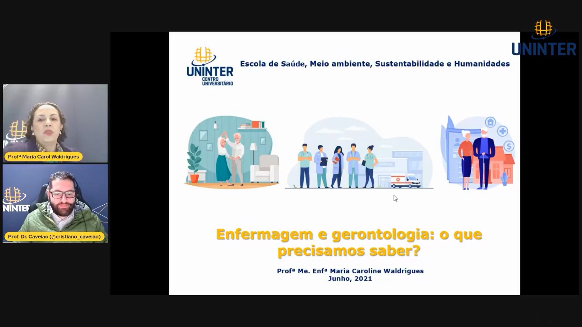O curso de Gerontologia da Uninter promoveu no dia 29.jun.2021 uma mesa-redonda para debater as práticas multiprofissionais no cuidado com o público idoso. Com a mediação dos professores Cristiano Caveião e Fabiana Prestes, o programa recebeu como convidadas as professoras Ivana Busato, Maria Caroline Waldrigues, Amanda Mendonça e Karolina Marques.