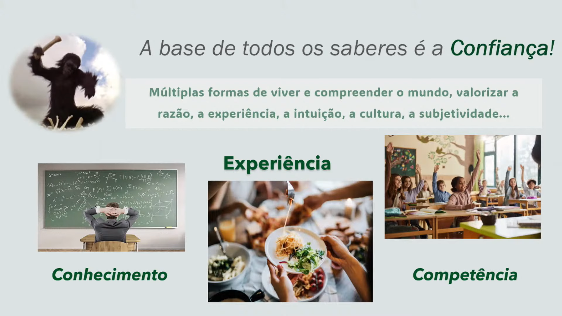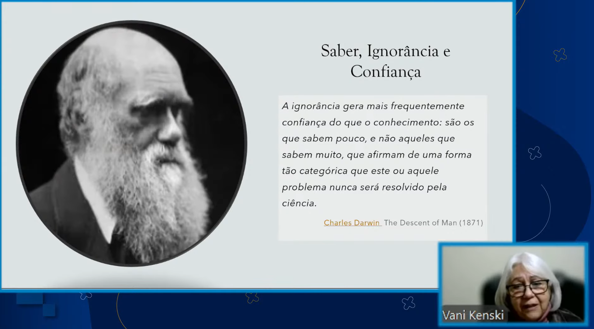Um dos conceitos centrais abordados foi o de ecologia dos saberes, que defende o diálogo entre diferentes formas de conhecimento, seja científico, ancestral, popular, artístico, digital e cotidiano. Para Vani, é nesse encontro que reside o potencial emancipador da educação. Além disso, a confiança também é importante como base do saber, “aquilo que sabemos, confiamos. E o que confiamos, incorporamos como parte da nossa existência”. No entanto, alertou para o perigo da falsa certeza, usando o Efeito Dunning-Kruger como exemplo de como o excesso de autoconfiança pode camuflar a ignorância.