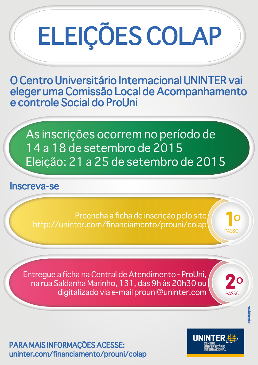 As eleições serão realizadas de 21 a 25 de setembro, no horário das 9 horas às 20:30 horas. Para mais informações acesse o site http://portal.uninter.com/prouni-colap/