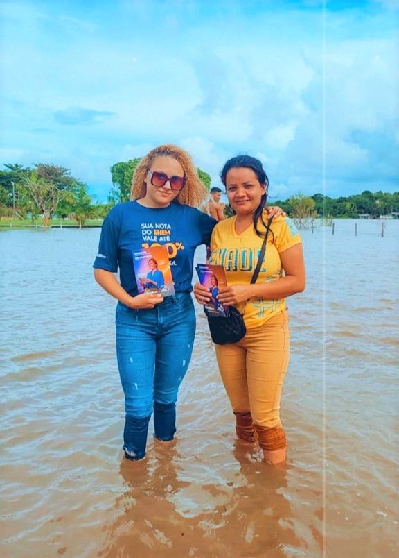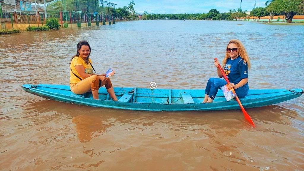 Em meio ao regime de cheias, com as águas do Amazonas cobrindo áreas que antes eram usadas por pedestres, as colaboradoras Marlene da Silva Brito e Regiane da Costa contornam as dificuldades para fazer a divulgação dos cursos da instituição. Elas usam uma canoa para se locomover pela região, um esforço da equipe do polo para levar a todos o acesso à educação.