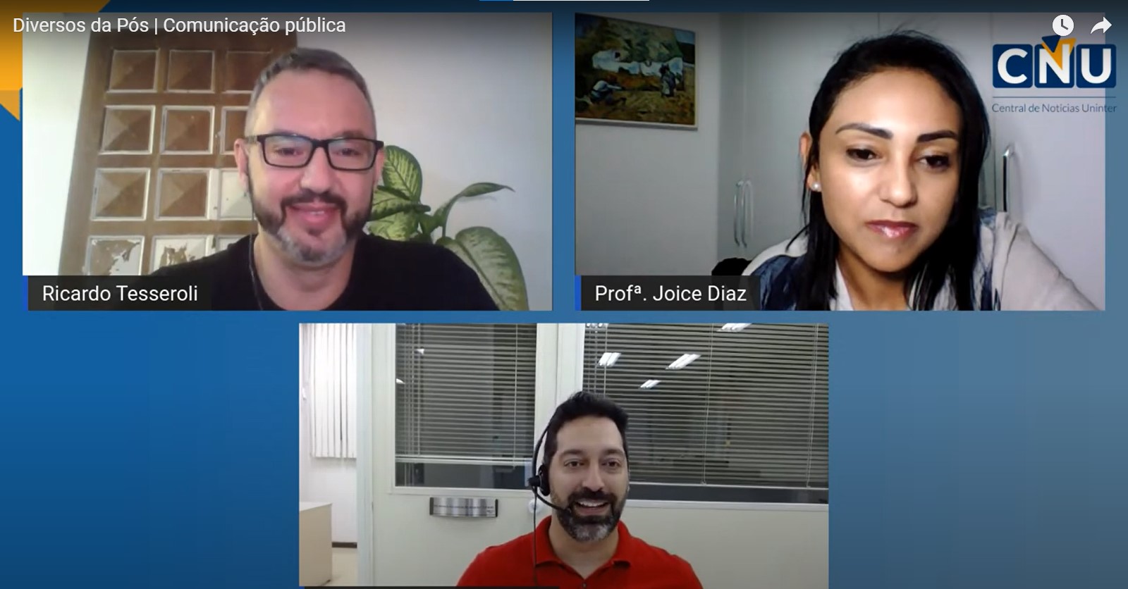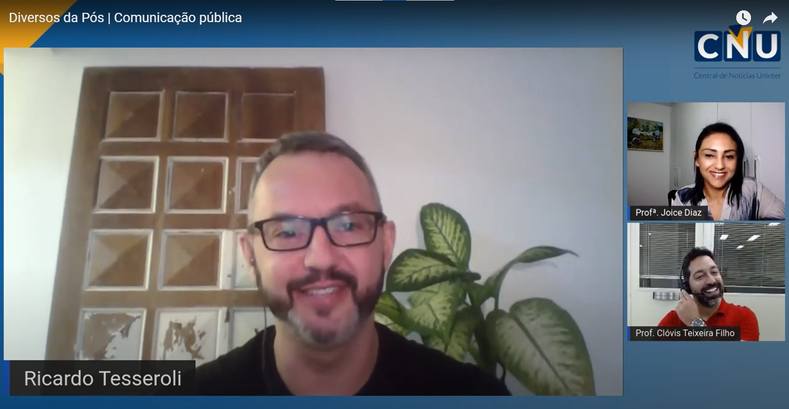 Tesseroli discutiu sobre comunicação pública em edição do programa Diversos da Pós, da Rádio Uninter,  exibido no dia 28.abr.2022. A live foi mediada pelos professores Joice Diaz e Clóvis Teixeira Filho. Para conferir o episódio na íntegra, clique aqui.