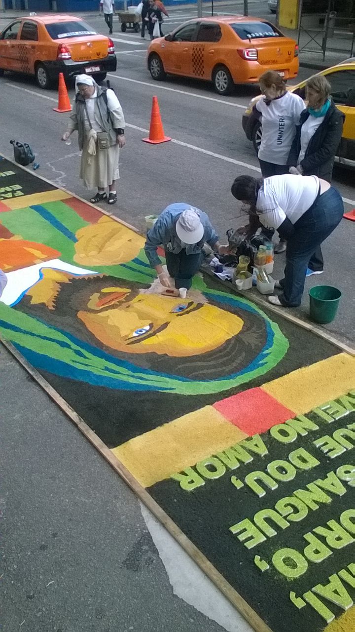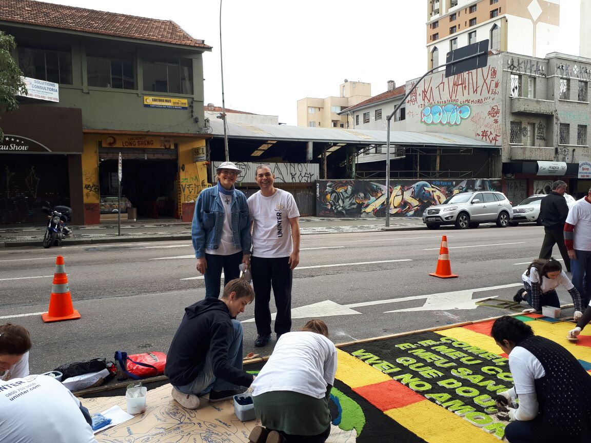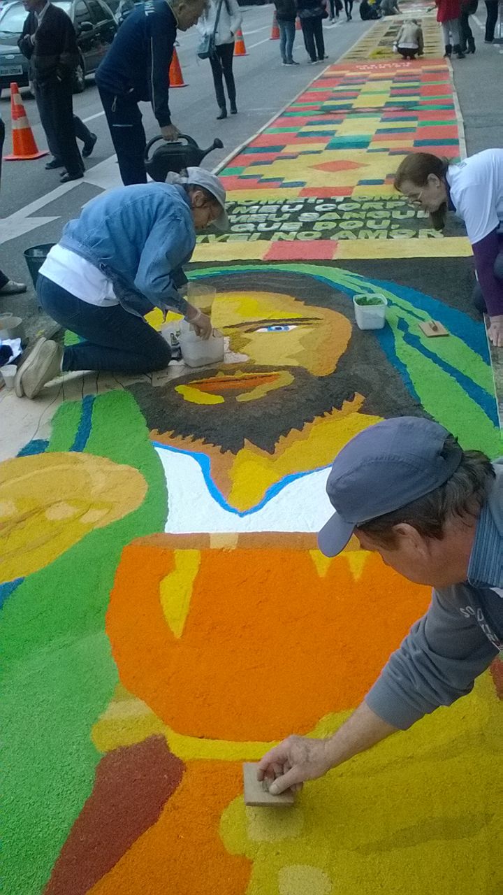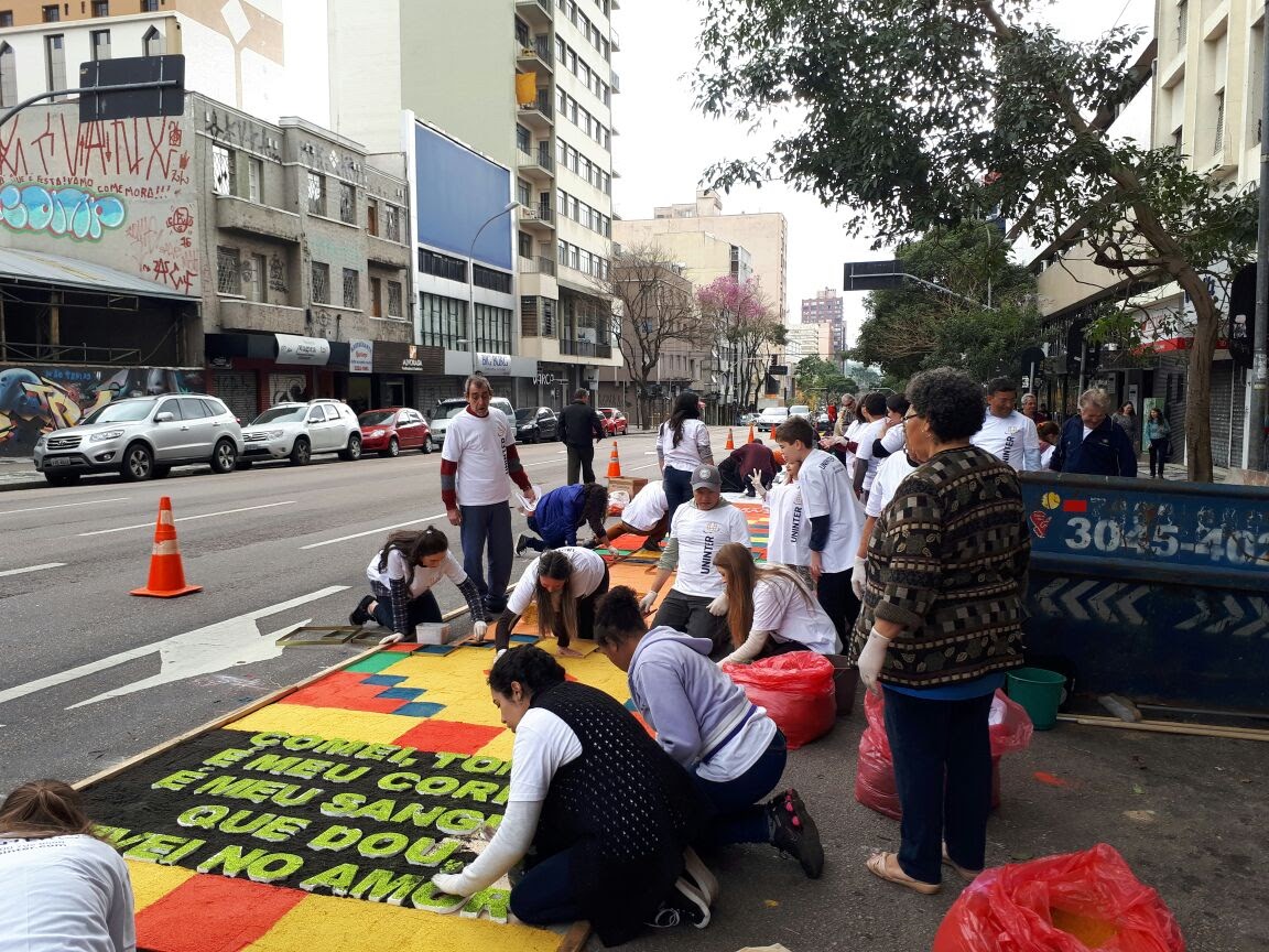 O grupo confeccionou 30 metros de tapete no último dia 15, quando se comemora o Corpus Christi, na Rua Barão do Serro Azul, na região central de Curitiba. Para isso, foi utilizado em torno de 150 quilos de serragem tingida no polo Carlos Gomes. A coordenação e desenvolvimento dos desenhos do tapete foram executados por Susan Moritz.