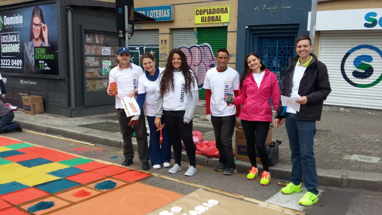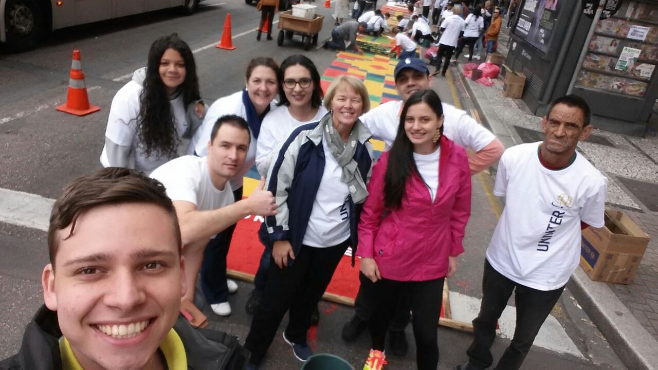 “Este grupo de voluntários confecciona o tapete há 10 anos. Todo ano, no início de maio, nos mobilizamos entrando em contato com esses voluntários para que eles participem conosco. É uma tradição. Quando o mês se aproxima, saímos em busca de serragem para que possamos tingi-las depois”, explica Zeneide Rodrigues Leal, gerente administrativo do polo Carlos Gomes da Uninter.