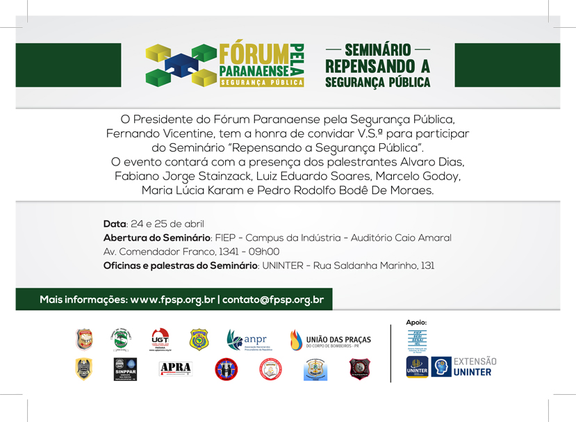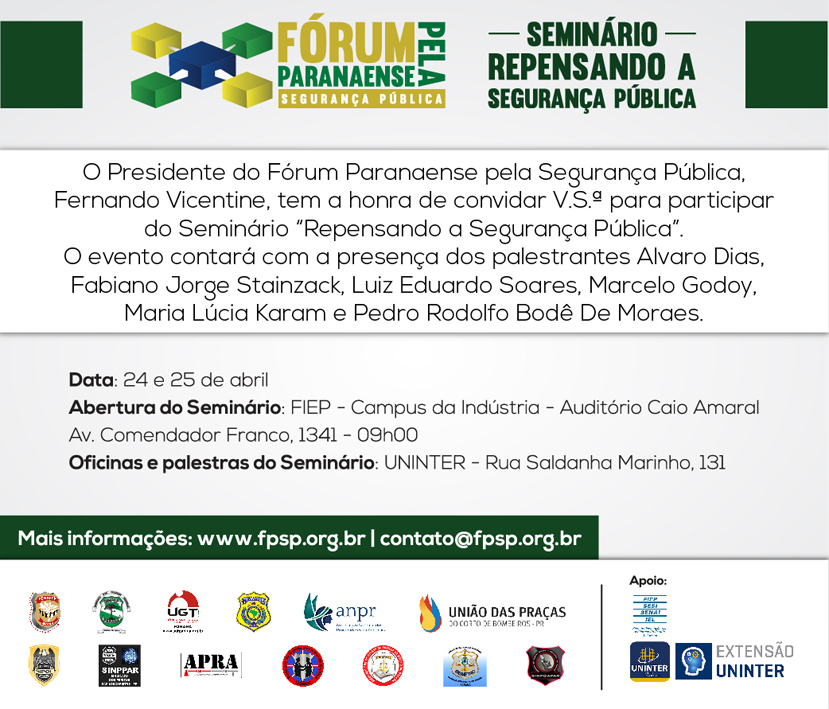 O Fórum Paranaense pela Segurança Pública e a Escola de Gestão Política e Jurídica do Centro Universitário UNINTER, em parceria com a Coordenação de Extensão e Assuntos Comunitários com seu Núcleo Cultural de Extensão UNINTER, estão promovendo o seminário Repensando a Segurança Pública. Com o objetivo de debater todos os problemas encontrados pelas entidades que participam ativamente da segurança pública no Paraná, tirar conclusões e gerar relatórios a partir das oficinas e dos direcionamentos apontados pelos palestrantes.