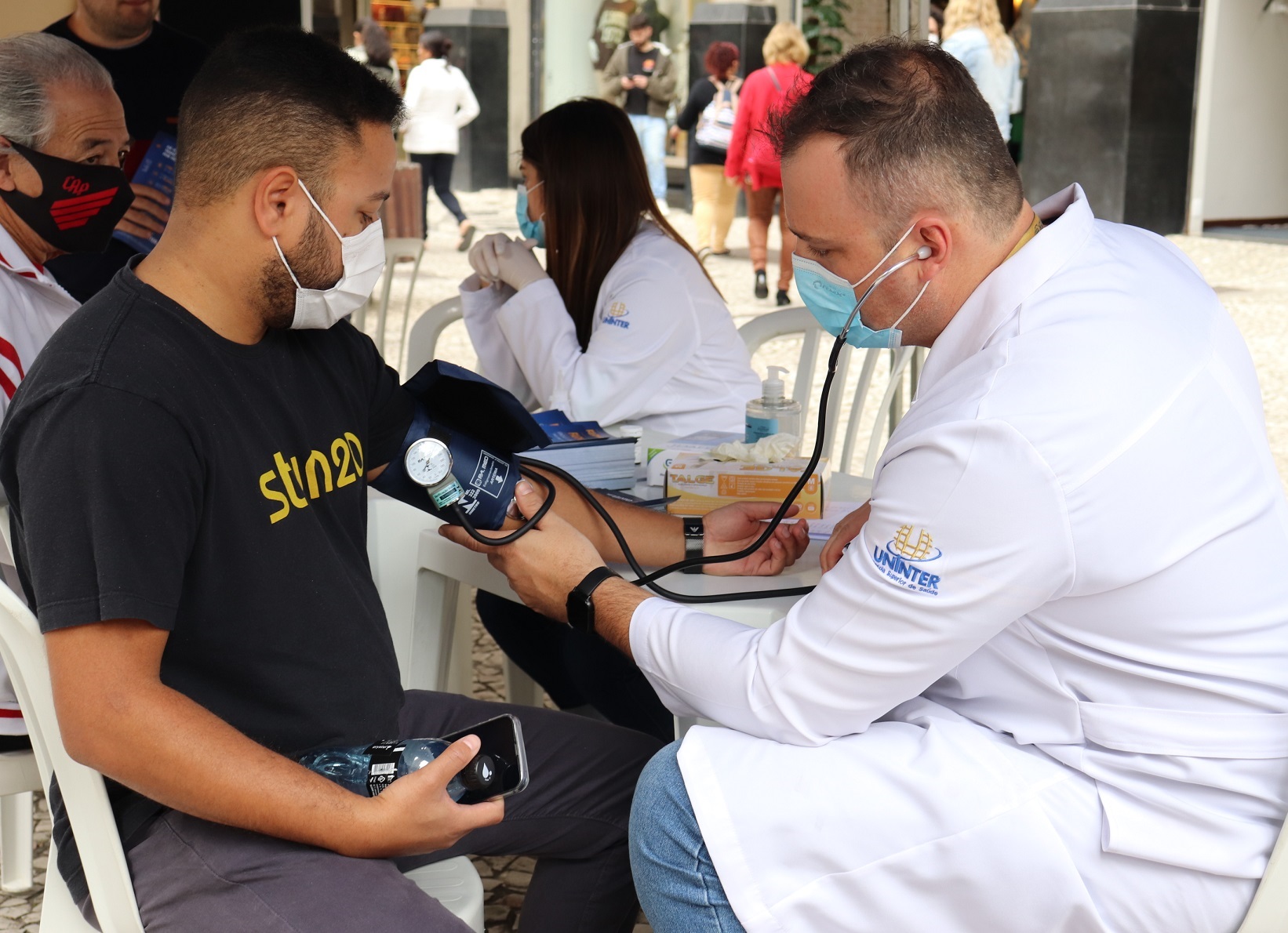 “Hoje nós estamos aqui realizando a aferição arterial e a aferição de glicemia capilar, duas ações importantes porque, quando a gente pensa na rotina do atendimento farmacêutico, muitos pacientes chegam procurando esses serviços, e o aluno de Farmácia hoje consegue, com uma série de intempéries e supervisão dos professores, colocar em prática aquilo que ele aprende em aula”, explica o coordenador do curso de Farmácia, Vinícius Bednarczuk.
