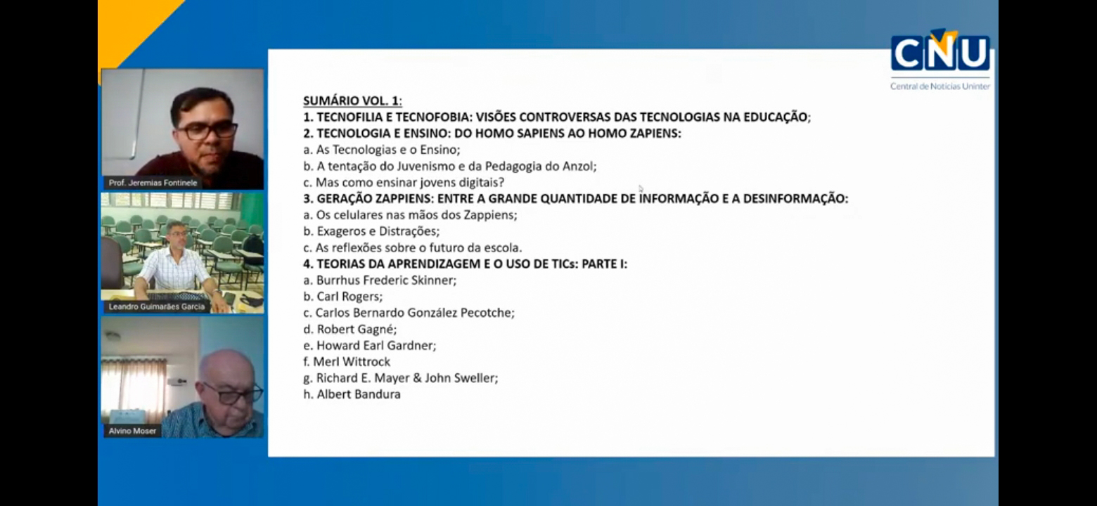 O assunto foi abordado no programa Atualidades da Educação, transmitido pela Rádio Uninter. Com o tema “Desafios contemporâneos da pedagogia”, o programa conduzido por Alvino Moser recebeu o professor Leandro Guimarães Garcia, que apresentou seu novo livro: “Possibilidades de Aprendizagem e mediações do Ensino com o Uso das Tecnologias digitais: desafios contemporâneos”. A obra, dividida em 2 volumes, já está disponível na biblioteca virtual da Uninter.