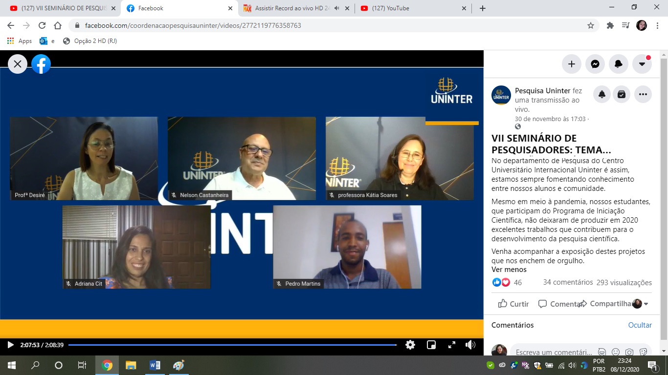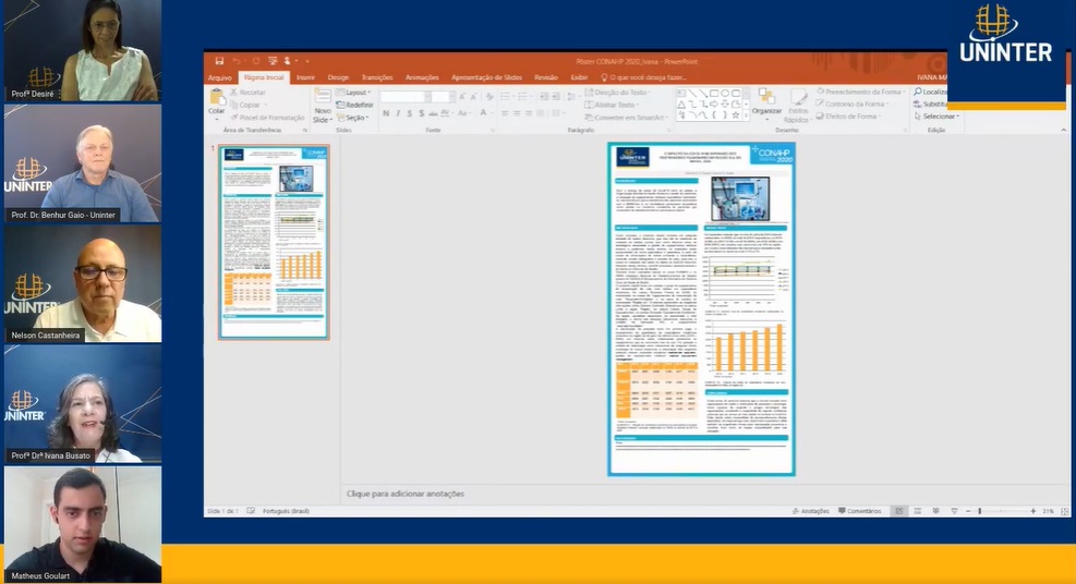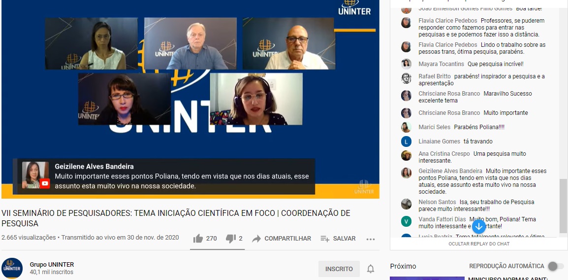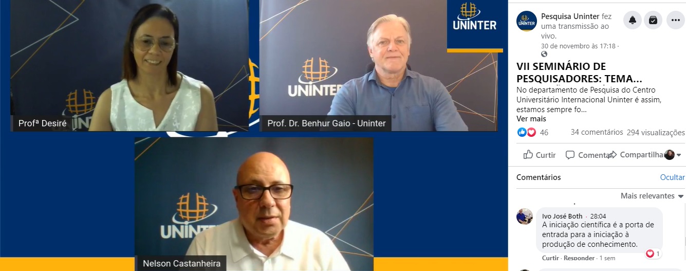 Através de uma transmissão ao vivo, no dia 30.nov.2020, na página Pesquisa Uninter e no canal Grupo Uninter, professores e alunos das Escolas Superiores apresentaram alguns dos trabalhos desenvolvidos ao longo deste ano. A apresentação do evento foi realizada pela professora Desiré Dominschek, coordenadora de pesquisa da instituição, com participações de Benhur e Castanheira.