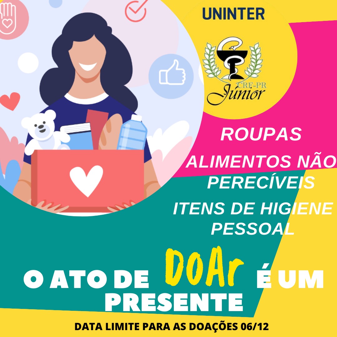 Com o objetivo de proporcionar um Natal mais alegre para os necessitados, os alunos do curso de Farmácia da Uninter estão promovendo uma ação solidária para orfanatos e asilos da região de Curitiba. A iniciativa é dos acadêmicos do CRF Jr. – Conselho Regional de Farmácia Júnior. A campanha está pedindo alimentos não perecíveis, roupas infantis e adultas, brinquedos e produtos de higiene pessoal. Os pontos de coleta são nos polos de apoio presencial Garcez, Tiradentes e Carlos Gomes, onde há caixas para armazenamento das doações. A campanha vai até dia 06/12/2020.