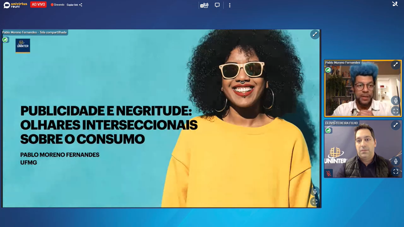 O tema Publicidade e Negritude: olhares interseccionais sobre o consumo foi debatido em uma transmissão ao vivo pelo AVA Univirtus, no dia 01.jun.2021, às 19h20, ao longo do programa Vem Saber. A conversa contou com mediação do professor Clóvis Teixeira Filho, coordenador dos cursos de pós-graduação na área de comunicação da Uninter.