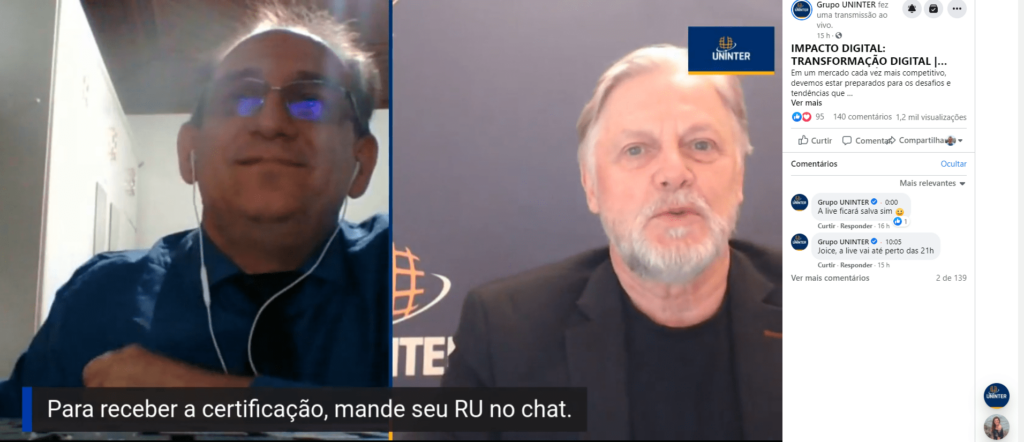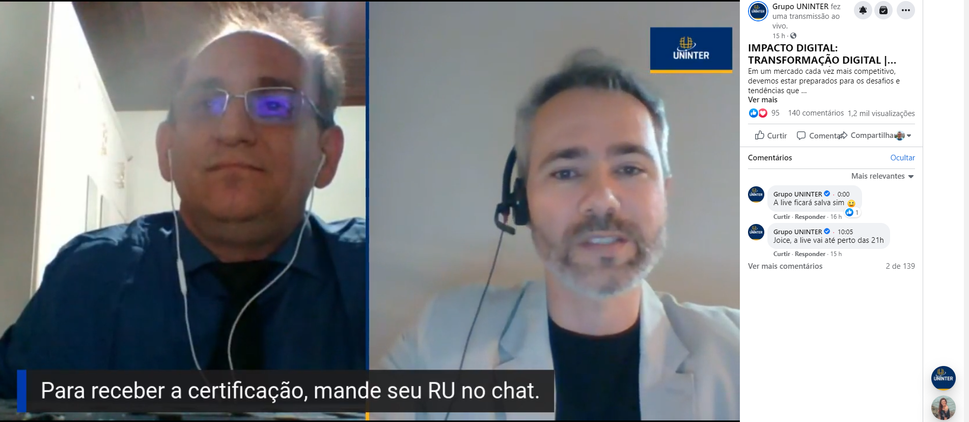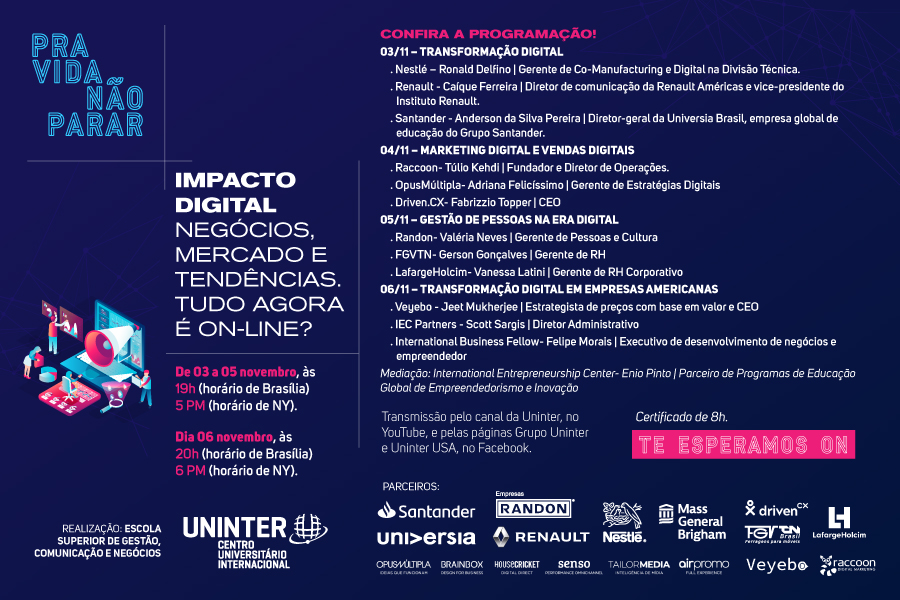 O evento “Impacto Digital – Negócios, Mercado e Tendências. Tudo agora é on-line?” reúne especialistas de grandes empresas e com ampla experiência para abordar assuntos como transformação digital, marketing e vendas digitais, gestão de pessoas na era digital e transformação digital em empresas americanas. O seminário é transmitido ao vivo pelo canal da Uninter no YouTube, e pelas páginas no Facebook do Grupo Uninter e Uninter USA. Realizado pela Escola Superior de Gestão, Comunicação e Negócios da Uninter, o evento ocorre entre os dias 03 e 06.nov.2020.