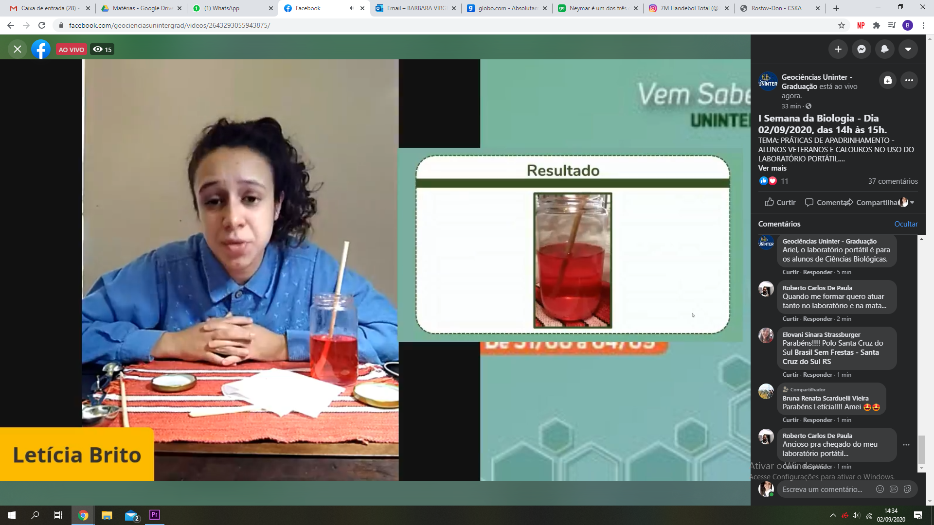 Lourival, estudante do polo da Uninter em Ourinhos (SP), optou por uma experiência de fermentação alcoólica com levedura. Utilizando tubos de ensaio, açúcar, fermento biológico, pipeta, água e bexigas, ele realizou todo o processo ao vivo e mostrou o resultado das lâminas do microscópio diretamente no vídeo.