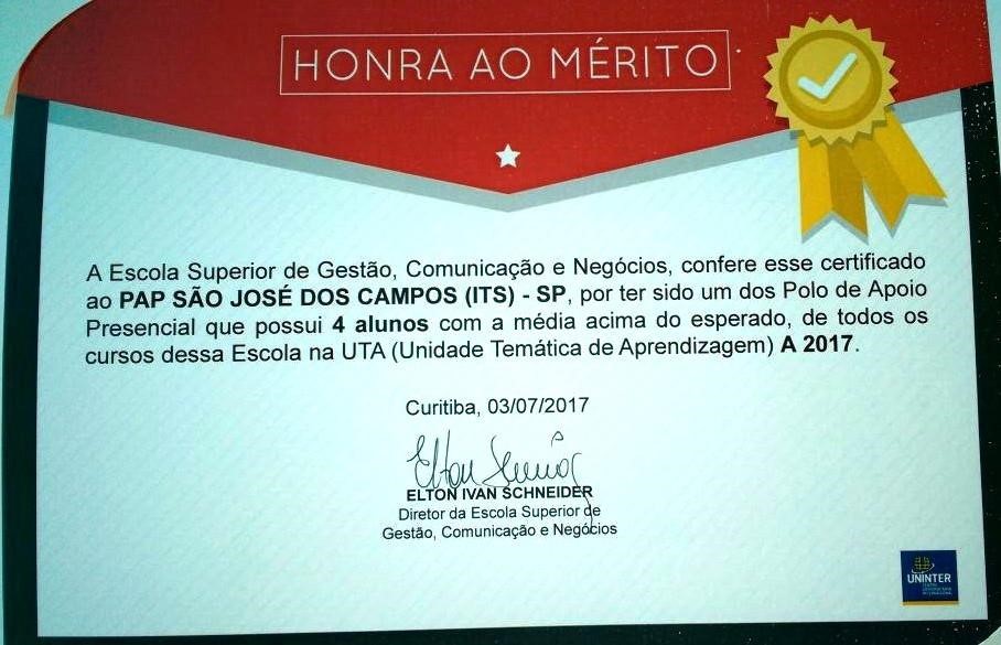 Estudar traz muitas vantagens. Reconhecimento é uma delas. A Uninter tem premiado os alunos que tiram maiores notas, todos com média geral acima de 94. O polo de apoio presencial da instituição em São José dos Campos (SP) premiou nos dias 18 de maio e 24 de agosto os estudantes que mais se destacaram durante o semestre nos cursos de Gestão Comercial, Logística e Marketing. São 725 estudantes de graduação e 280 de pós-graduação atendidos no polo.